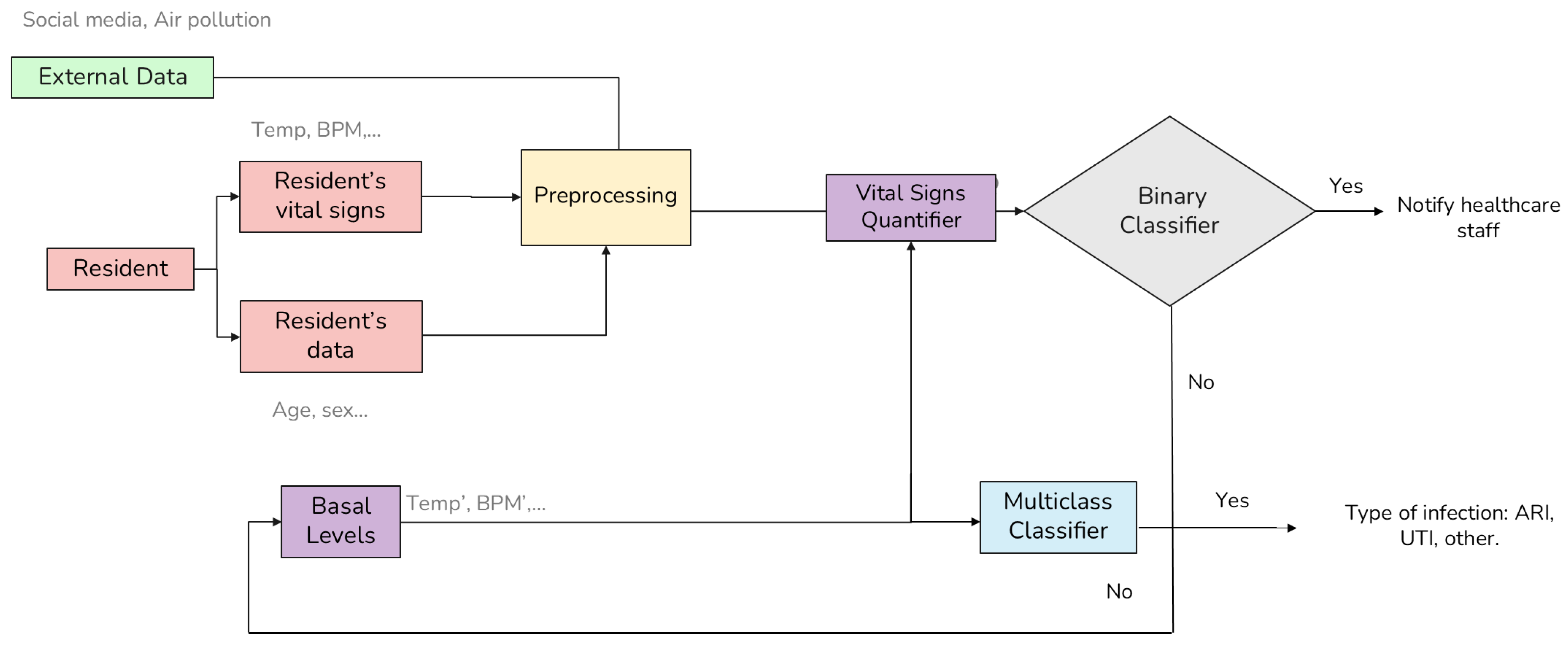 - Garcés-Jiménez, A.; Polo-Luque, M.-L.; Gómez-Pulido, J.A.; Rodríguez-Puyol, D.; Gómez-Pulido, J.M. Predictive Health Monitoring: Leveraging Artificial Intelligence for Early Detection of Infectious Diseases in Nursing Home Residents through Discontinuous Vital Signs Analysis. Comput. Biol. Med. 2024, 174, 108469. [Google Scholar] [CrossRef] [PubMed]