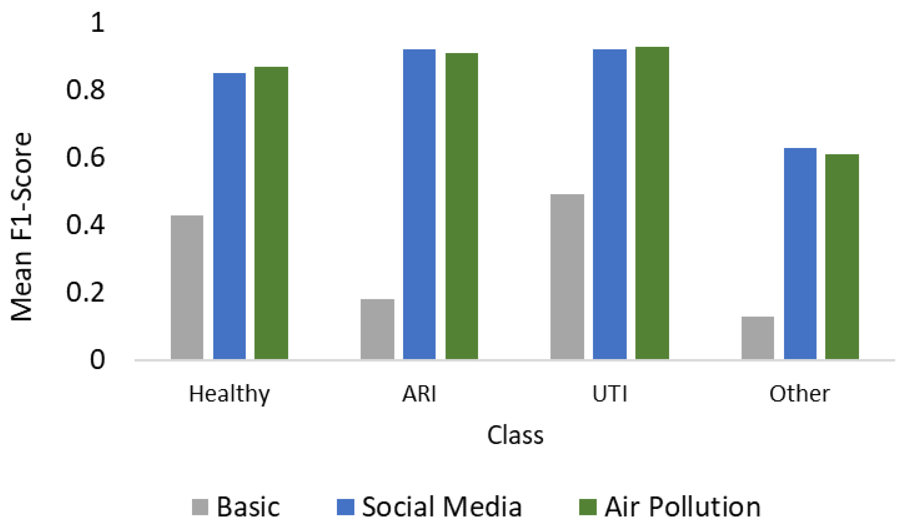 - Air Pollution Model: Also demonstrated exceptional performance (Recall > 0.95 for both ARI and UTI), likely leveraging meteorological correlations (e.g., temperature drops associated with respiratory outbreaks).