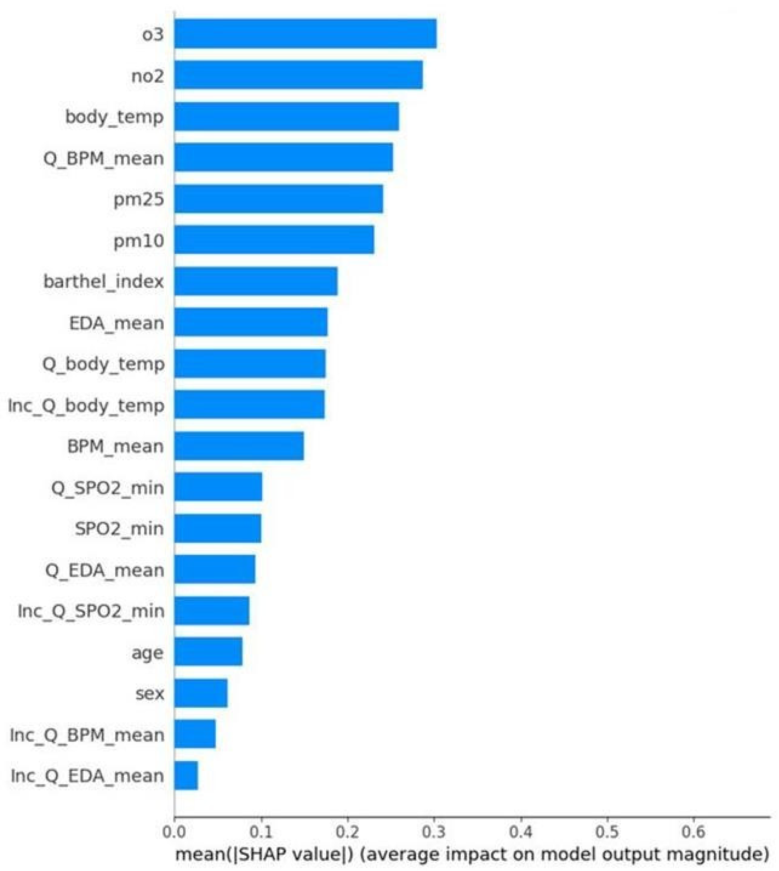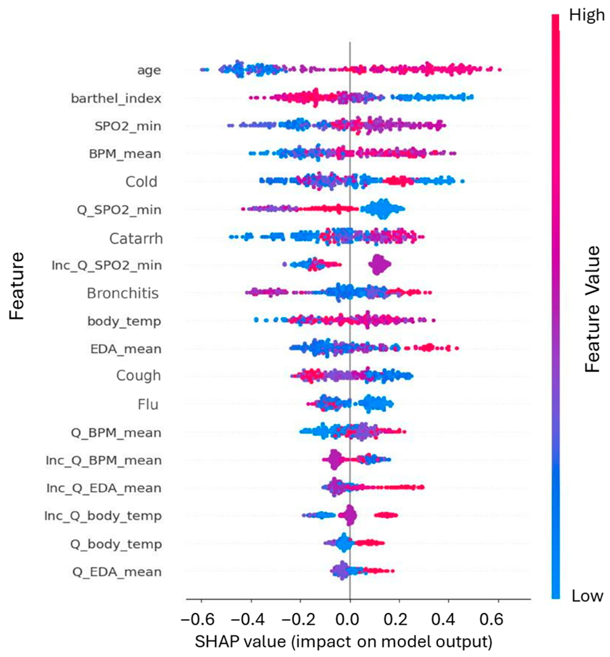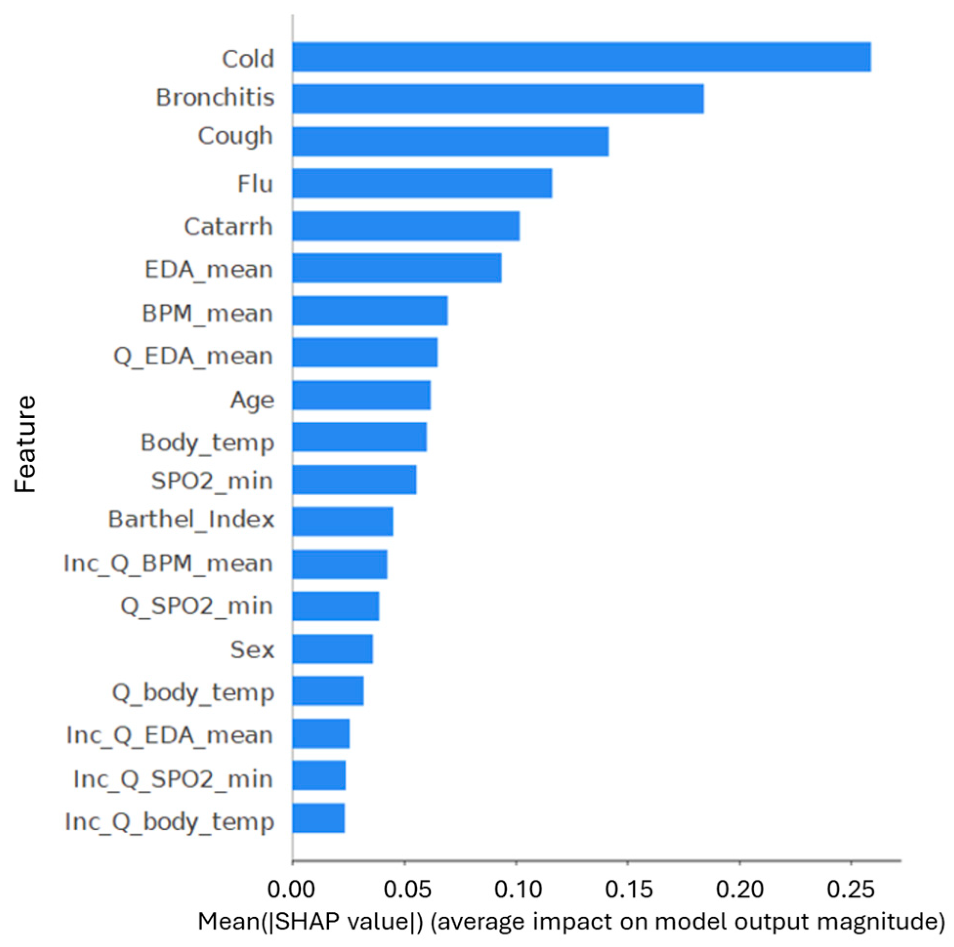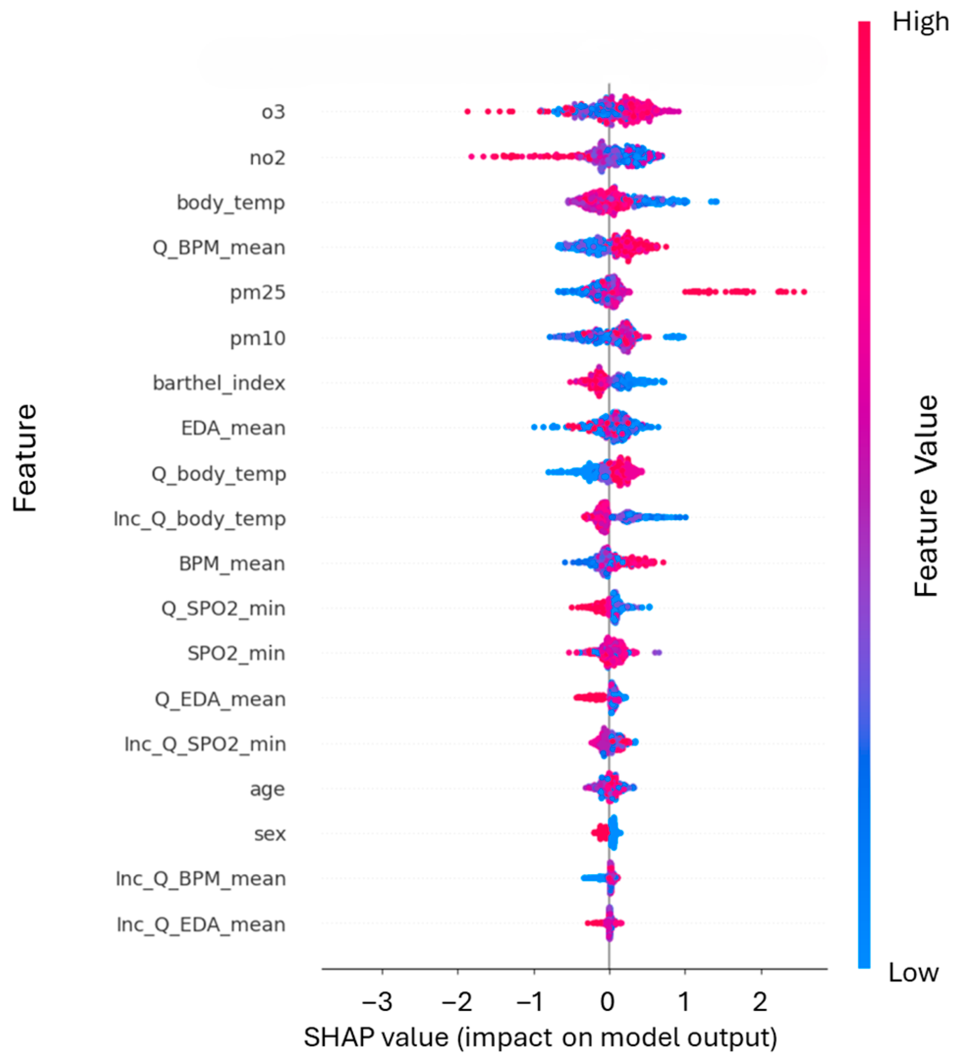 - Physiological Data (Internal Source): Measurements were collected daily using wearable biosensors recording Body Temperature (TEMP), Electrodermal Activity (EDA), Oxygen Saturation (SpO2), and Heart Rate (BPM). Trained medical personnel oversaw collection according to established protocols described in the SPIDEP Project [5]. These were complemented by demographic data (age, sex) and clinical characteristics, specifically the Barthel Index, which measures the patient’s performance in activities of daily living and functional independence.