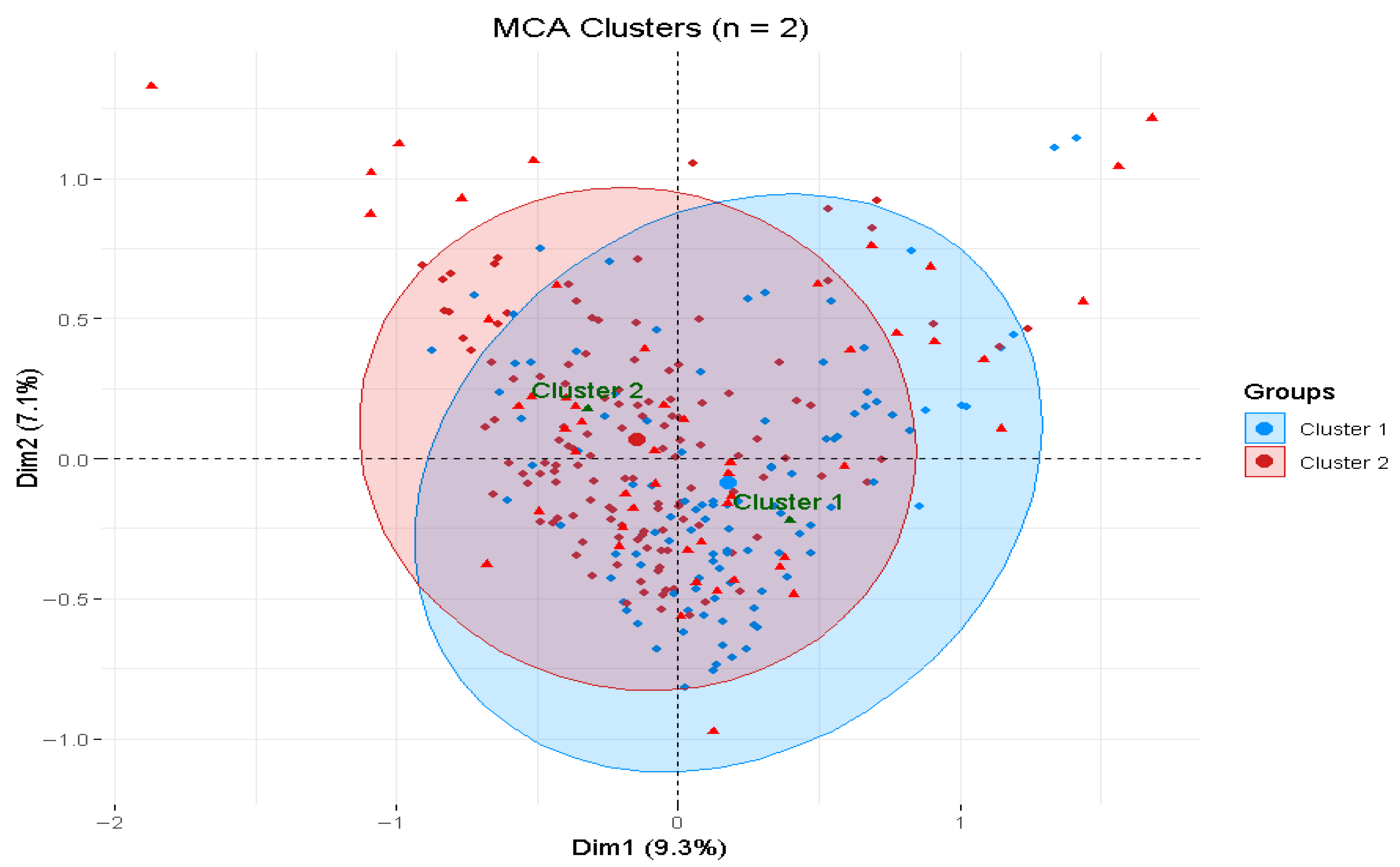 | Variable | Categories | Cluster 1 (n = 104) | Cluster 2 (n = 128) | Total | p-Value |