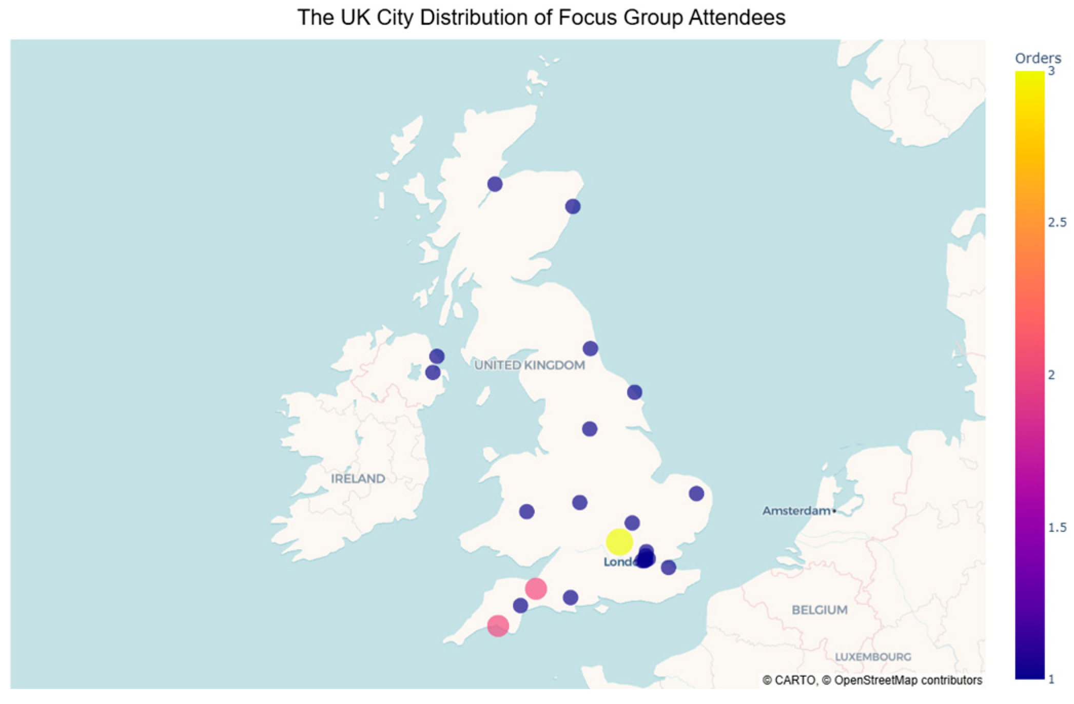 Figure 1. Geographical distribution of focus group attendees. Note. Location markers are approximate to protect the anonymity of individual participants.