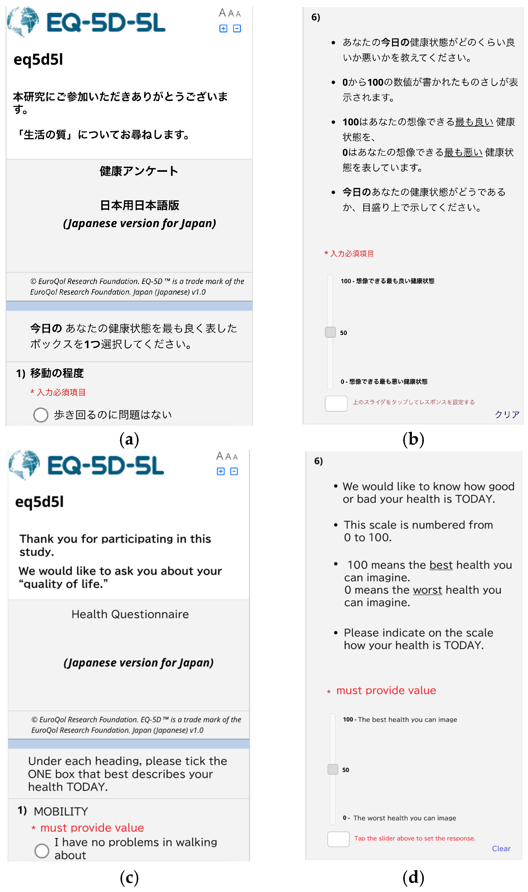 - Herdman, M.; Gudex, C.; Lloyd, A.; Janssen, M.F.; Kind, P.; Parkin, D.; Bonsel, G.; Badia, X. Development and preliminary testing of the new five-level version of EQ-5D (EQ-5D-5L). Qual. Life Res. 2011, 20, 1727–1736. [Google Scholar] [CrossRef] [PubMed]
