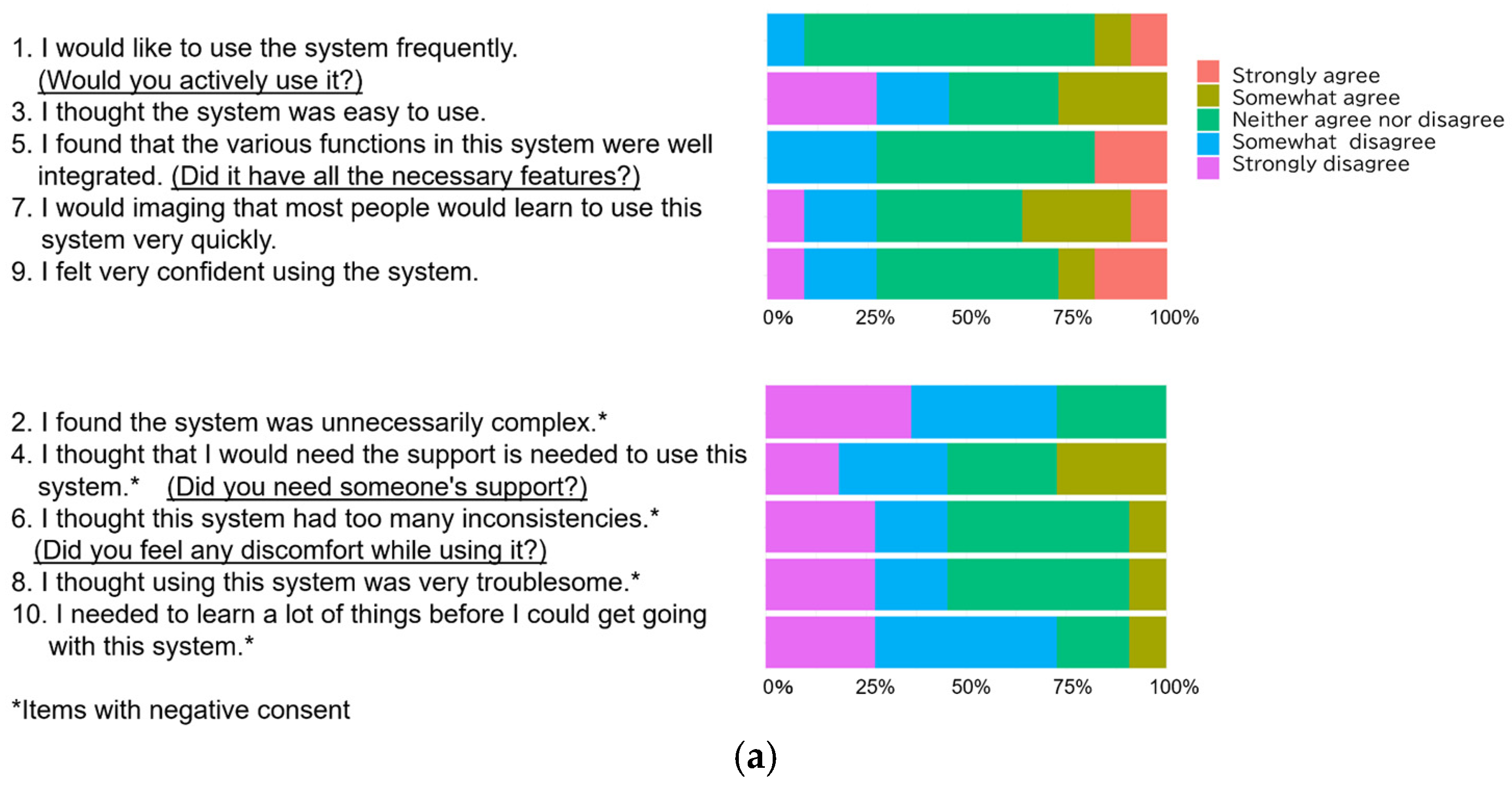 - Sato, K.; Mitomi, N.; Kon, K.; Haruna, H. Examination of the Reliability of the System Usability Scale (SUS) in the Prosthetics and Orthotics Field. J. Jpn. Acad. Prosthetists Orthotists 2022, 30, 32–37. [Google Scholar] [CrossRef]