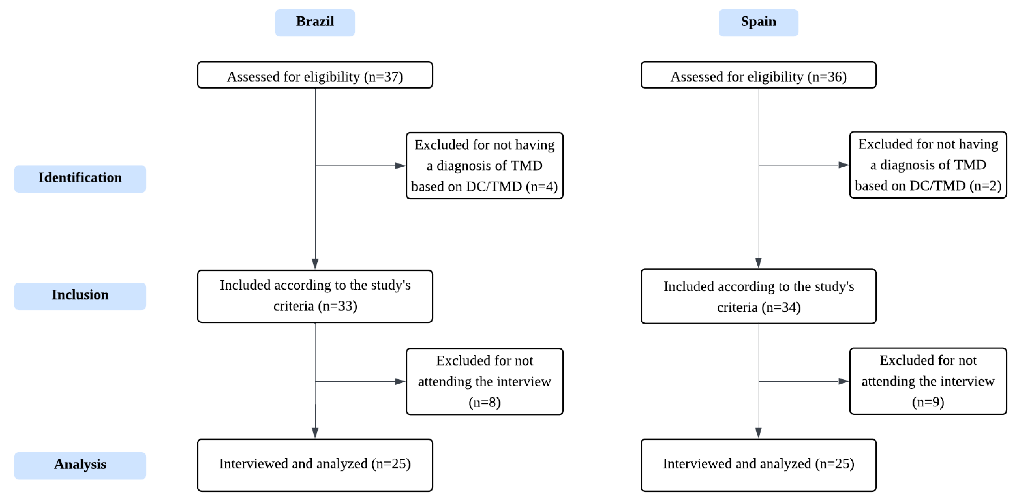 APA StyleMendes, L. M. R., Palacios-Ceña, M., Palacios-Ceña, D., Cuadrado, M.-L., Falahat, F., Alonso-Juarranz, M., Marçal, J. C. S., Rosa, M. D. D., Bevilaqua-Grossi, D., & Florencio, L. L. (2026). Perceptions of Individuals/Patients with Temporomandibular Disorders About Their Diagnosis, Information Seeking and Treatment Expectations: A Comparative Qualitative Study of Brazilian and Spanish Individuals. Healthcare, 14(2), 227. https://doi.org/10.3390/healthcare14020227