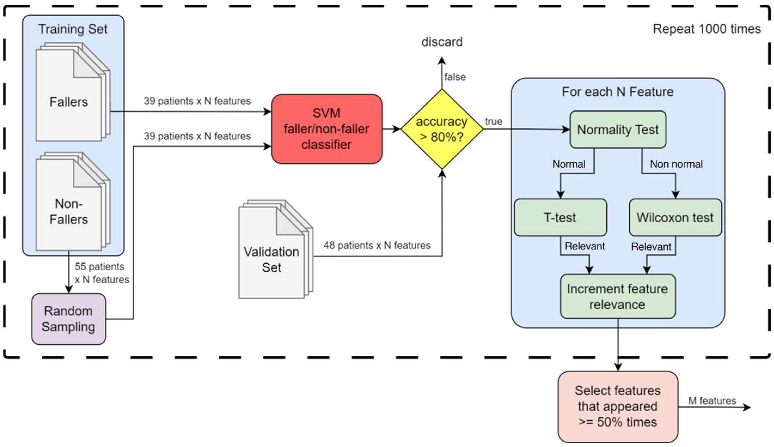 - Combining Rankings. Since we have M features, the previous process results in M distinct preliminary strata assignments (one for each feature). To obtain a single fall risk classification, we employ the mode (most frequent value) of these M assignments. In case two strata have the same highest frequency (a tie), we assign the higher risk stratum (medium over low, high over medium).