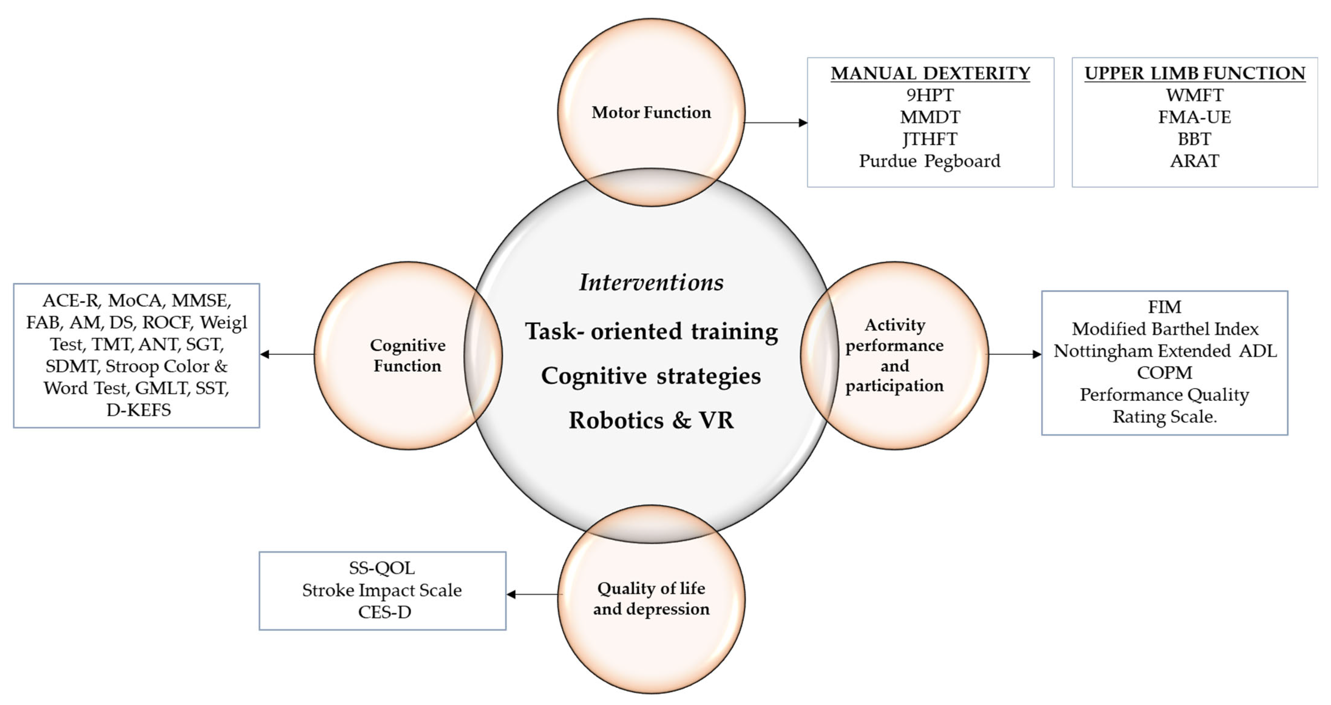 - Santisteban, L.; Térémetz, M.; Bleton, J.P.; Baron, J.C.; Maier, M.A.; Lindberg, P.G. Upper limb outcome measures used in stroke rehabilitation studies: A systematic literature review. PLoS ONE 2016, 11, e0154792. [Google Scholar] [CrossRef] [PubMed]