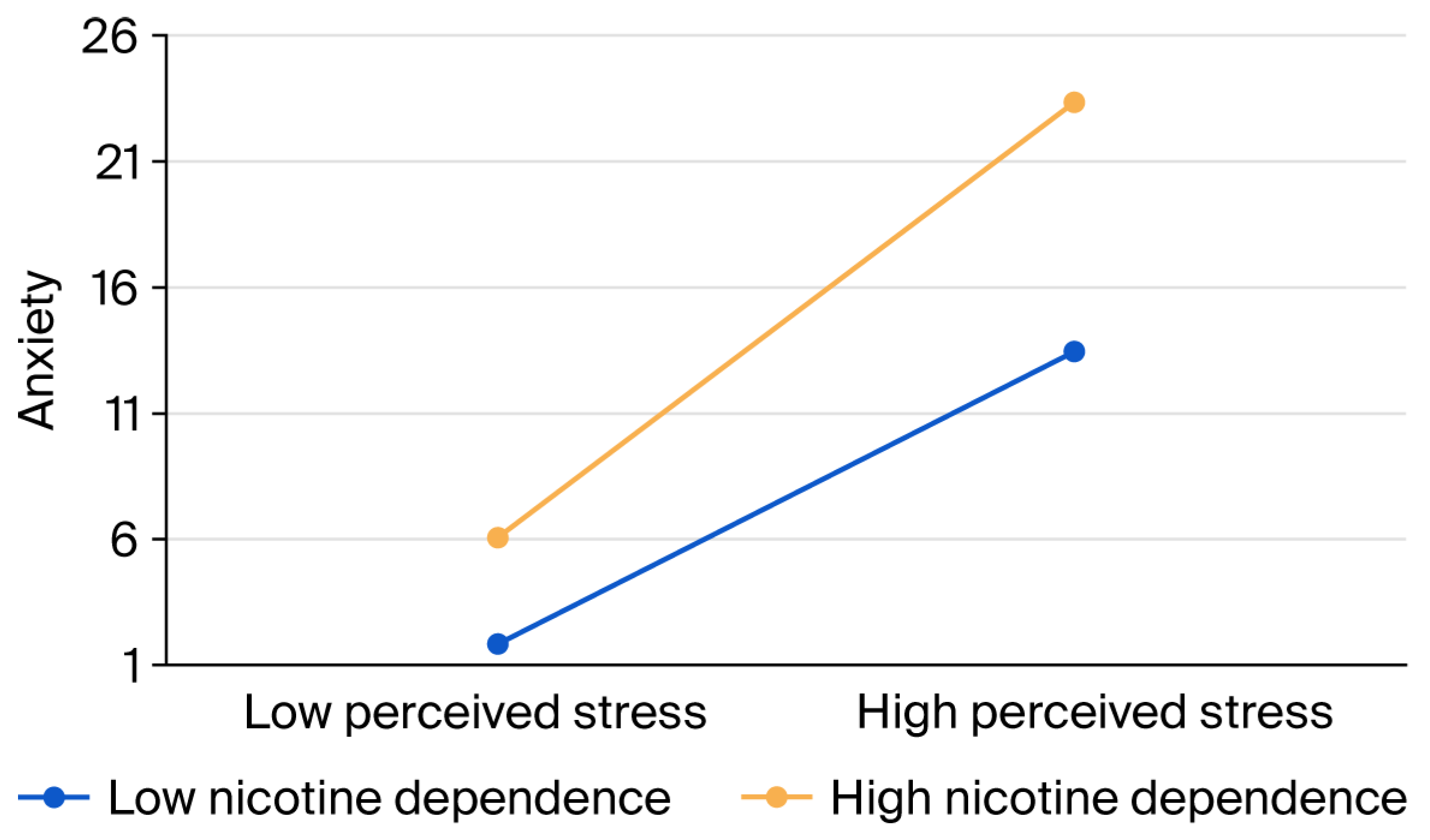 | Interaction Z_Nicotine dependence (FTND) × Z_Perceived stress | 0.119 | 3.390 | <0.001 | 0.544 | 0.013 ** | 0.088 | 0.330 |