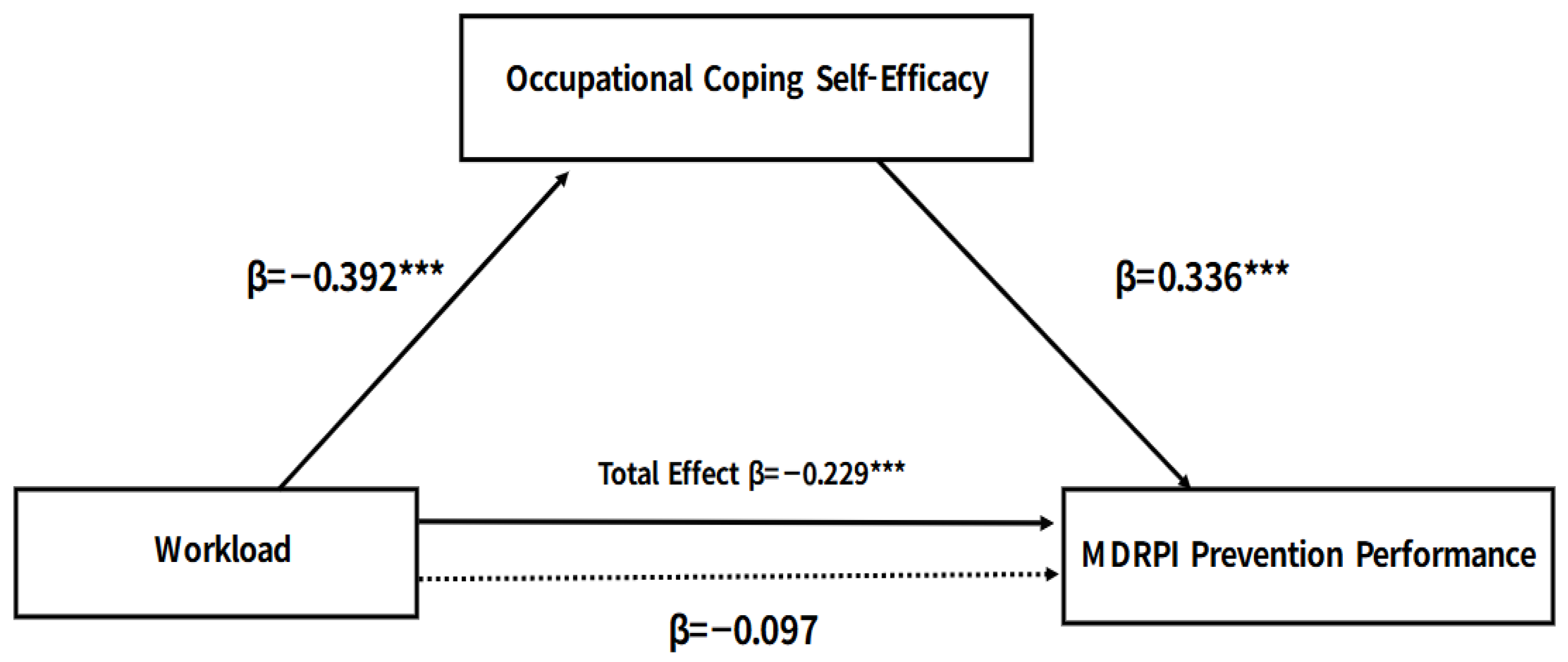 3.4. Mediating Effect of Occupational Coping Self-Efficacy on the Relationship Between Work Load and MDRPI Prevention Performance