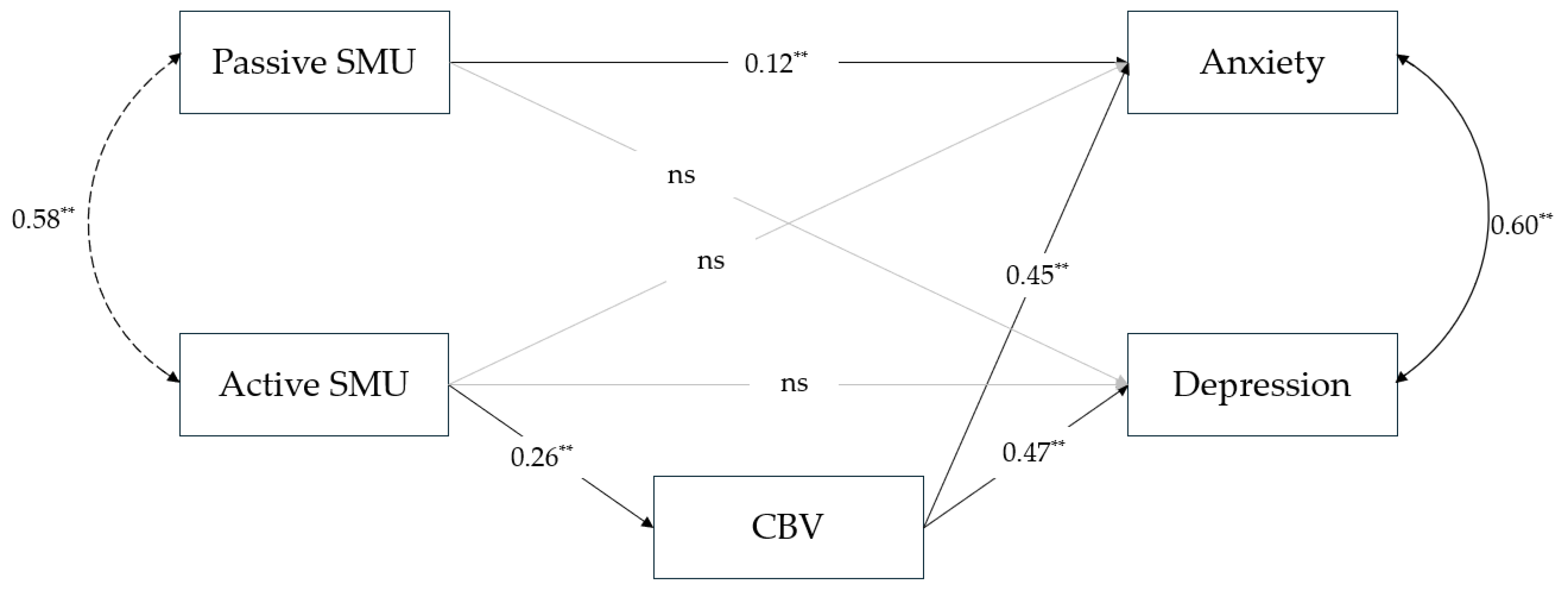 - Godard, R.; Holtzman, S. Are Active and Passive Social Media Use Related to Mental Health, Wellbeing, and Social Support Outcomes? A Meta-Analysis of 141 Studies. J. Comput.-Mediat. Commun. 2024, 29, zmad055. [Google Scholar] [CrossRef]