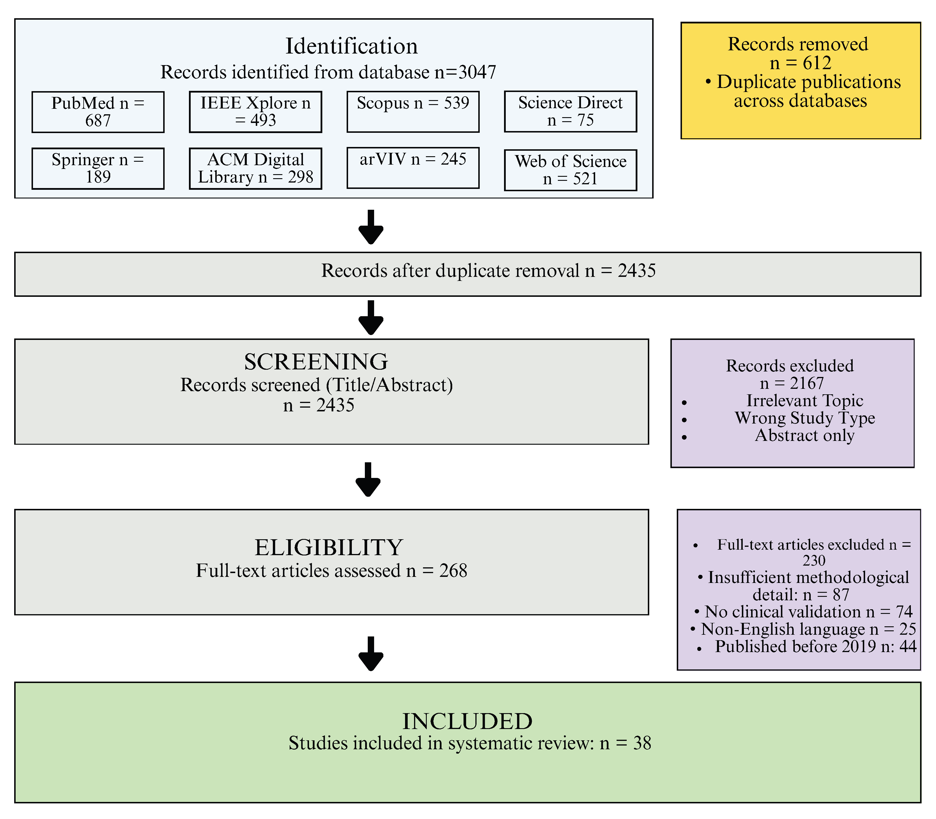 Figure 1 shows the systematic study selection process. The initial database search identified 3047 potentially relevant articles. After removing 612 duplicates, 2435 unique articles remained for title and abstract screening, resulting in the exclusion of 2167 articles. Full text assessment of 268 articles led to the final inclusion of 38 studies Full text assessment of 302 articles led to the final inclusion of 38 studies that met all eligibility criteria and explicitly addressed ethical considerations in FL for healthcare.