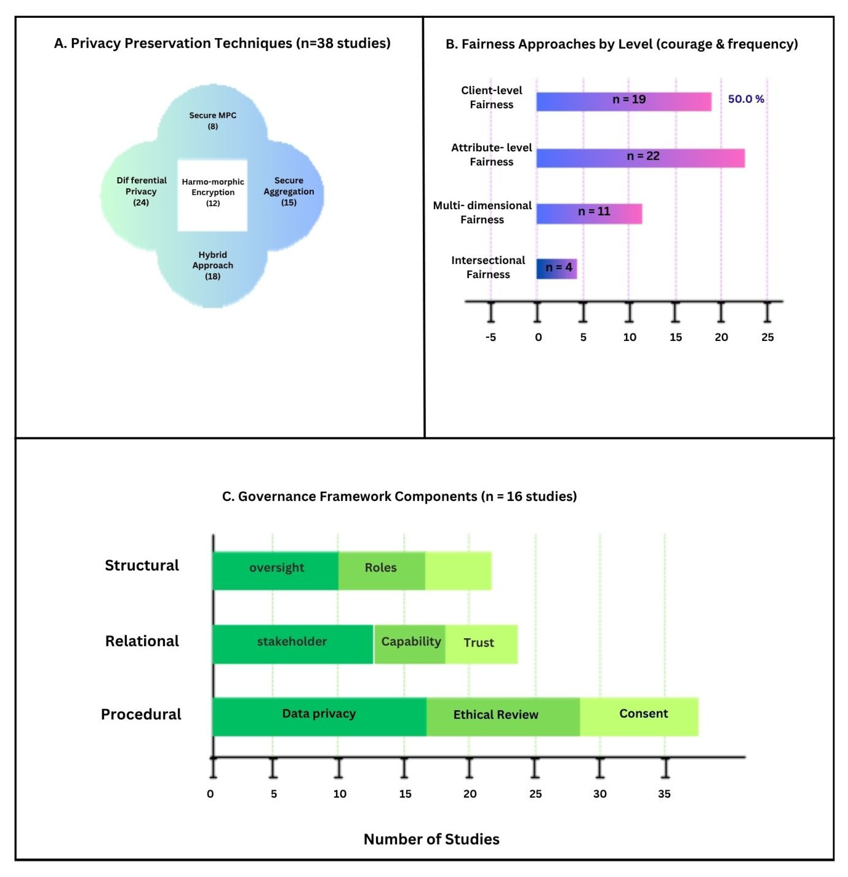 The analysis showed emerging but still underdeveloped governance frameworks for healthcare FL. Of the 38 included studies, 16 were be 42.1%, explicitly discussed governance mechanisms, with substantial heterogeneity in components and depth of governance considerations shown in