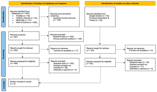 Initially, 1097 records were identified in the databases. After removing duplicates, 957 records were screened based on their titles and abstracts. Of these, 472 records were excluded based on irrelevant titles and abstracts, leaving 485 records. Of the 485 records, 17 could not be retrieved in full text (despite attempts to access through institutional resources), leaving 468 records for eligibility assessment. In the next step, 423 records were excluded due to irrelevant research topics, not including both studied concepts (caring and missed nursing care), being editorials or opinion pieces. In addition, screening in Google Scholar and ProQuest Dissertation & Theses of 100 records was performed. Of these, five records could not be retrieved in full text (despite attempts to access through institutional resources), leaving 95 records for eligibility assessment. In the next step, 94 records were excluded because they were irrelevant to the research topics, did not include both studied concepts (caring and missed nursing care), or were editorials or opinion pieces. Finally, one record was identified that met the inclusion criteria. A total of five studies were included in the final analysis, as shown in the PRISMA flowchart [49] (Figure 1).