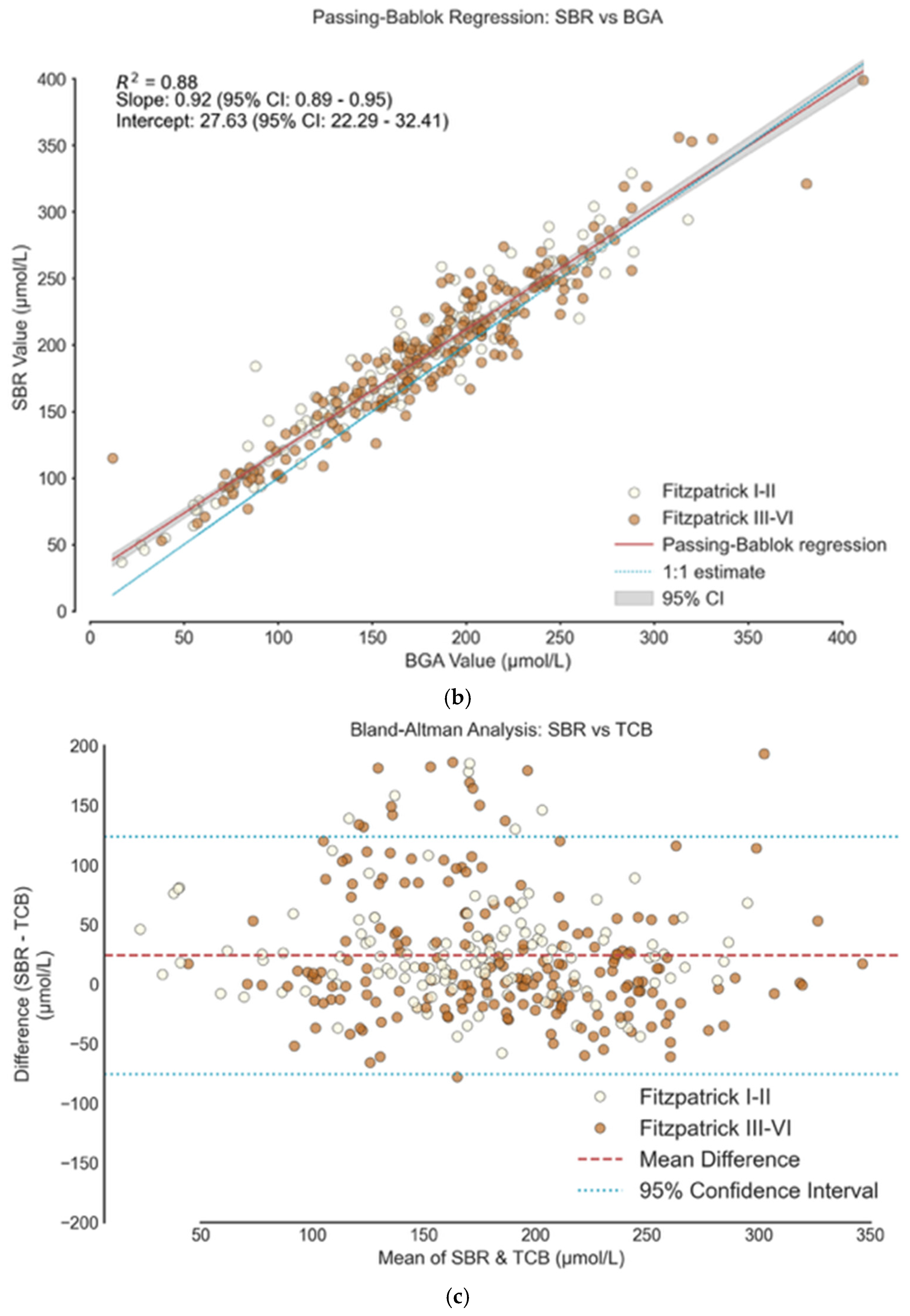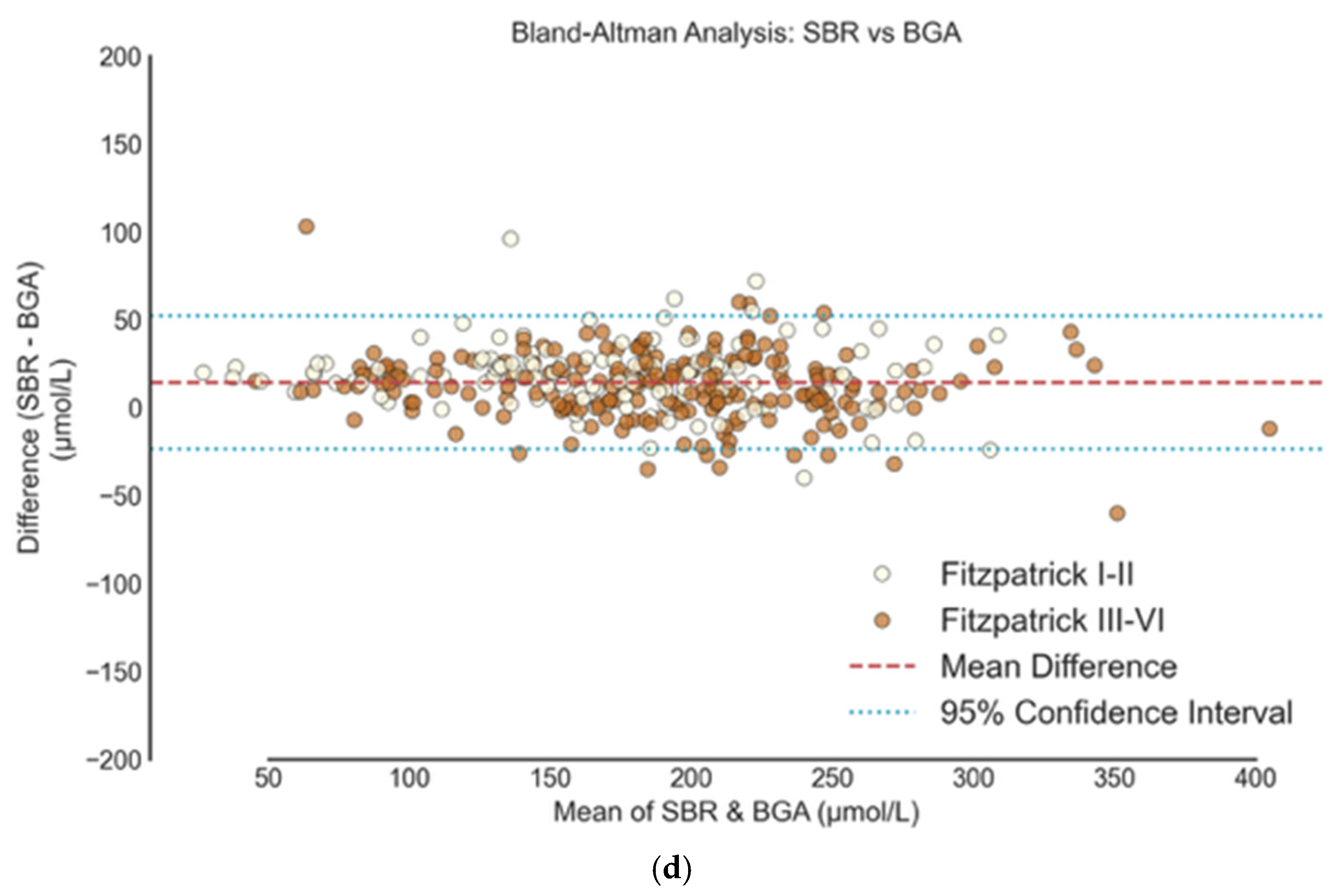 - Transcutaneous bilirubinometry accuracy significantly reduced post-phototherapy and showed reduced predictive value in darker-skinned neonates (Fitzpatrick III–VI), while the blood gas analyser demonstrated superior diagnostic performance with a diagnostic odds ratio of 47.5.
