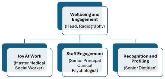 The Division consisted of 715 professionals (in October 2024) representing 23 professional groups, for example, audiologists, clinical psychologists, dietitians, medical social workers, radiographers, and rehabilitation therapists of varying staff strengths. The CGH AHD Wellbeing and Engagement Team was established in April 2024. The Team operates CGH’s three-pillar wellness framework through its own logic framework Joy at Work programs, Staff Profiling and Recognition initiatives, and Staff Engagement strategies to foster resilience, engagement, and joy at work in the Division (see Figure 1). The Wellbeing and Engagement Team is an innovative collaborative model where three domain leads from diverse AHP groups work synergistically to enhance staff wellness, resilience, and sustained joy at work among the AHPs. The Team is headed by the AHD Shared Service Lead in Wellbeing and Engagement whose appointment serves as the strategic coordinator, providing overarching direction and ensuring alignment among the three domains whilst maintaining focus on the broader organizational wellness objectives.