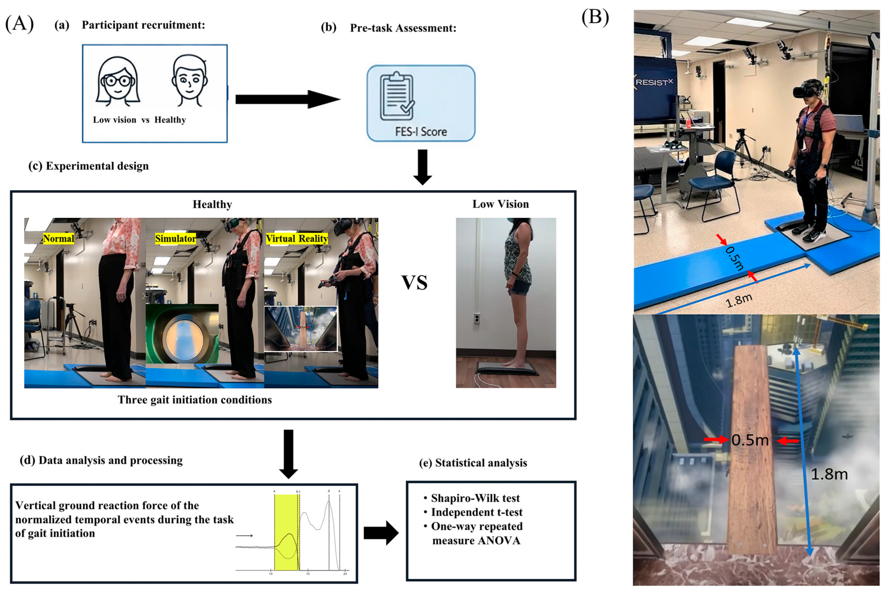 Figure 2B), specifically designed to evoke a fear of heights and falling. The VR condition was delivered using an HTC VIVE Cosmos Elite head-mounted display (HTC Corporation, Taiwan, China). The SS condition employed a non-immersive visual impairment simulator designed to reduce visual clarity and contrast, thereby mimicking low-vision conditions. The same gait initiation task instructions and verbal cues were used across all experimental conditions. Three trials were completed for each condition, with rest provided between trials as needed. All experimental procedures were completed within a single session lasting less than one hour.