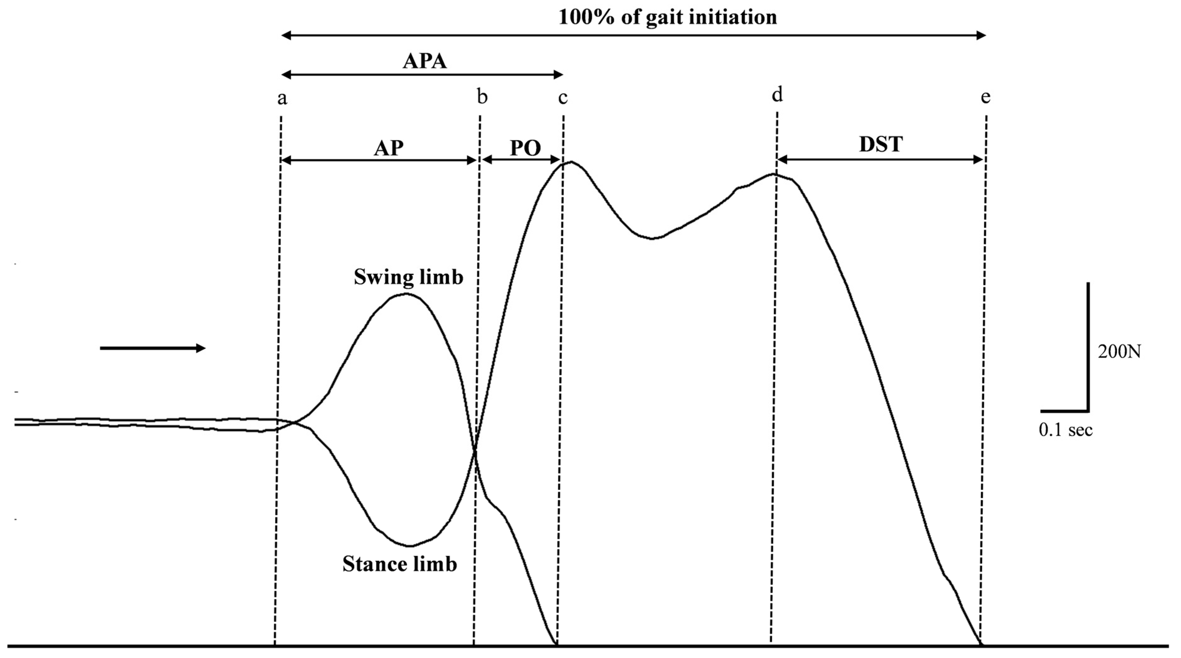 Figure 3). As such, relative temporal events are represented in percentages. The dependent variables are anticipation phase (AP), push-off phase (PO), anticipatory postural adjustment phase (APA), and double limb support time phase (DST) of both absolute and relative temporal events during GI. No kinematic data were collected in this study; all dependent variables were temporal events of gait initiation derived from vertical ground reaction forces.