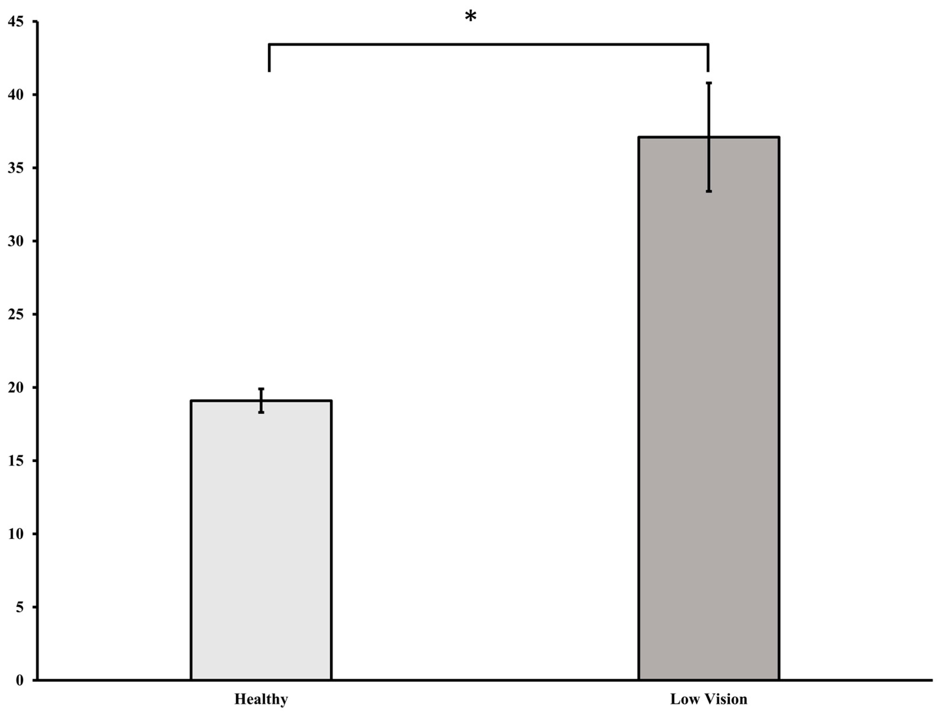 36]. Notably, the movement strategies observed in individuals with low vision were comparable to those seen under fear-inducing virtual height conditions, characterized by constrained dynamic weight shifting. This quantitative reduction in anticipatory weight transfer likely reflects a chronic adaptive response to fear of falling, highlighting the severity and persistence of balance-related anxiety in the low-vision population.