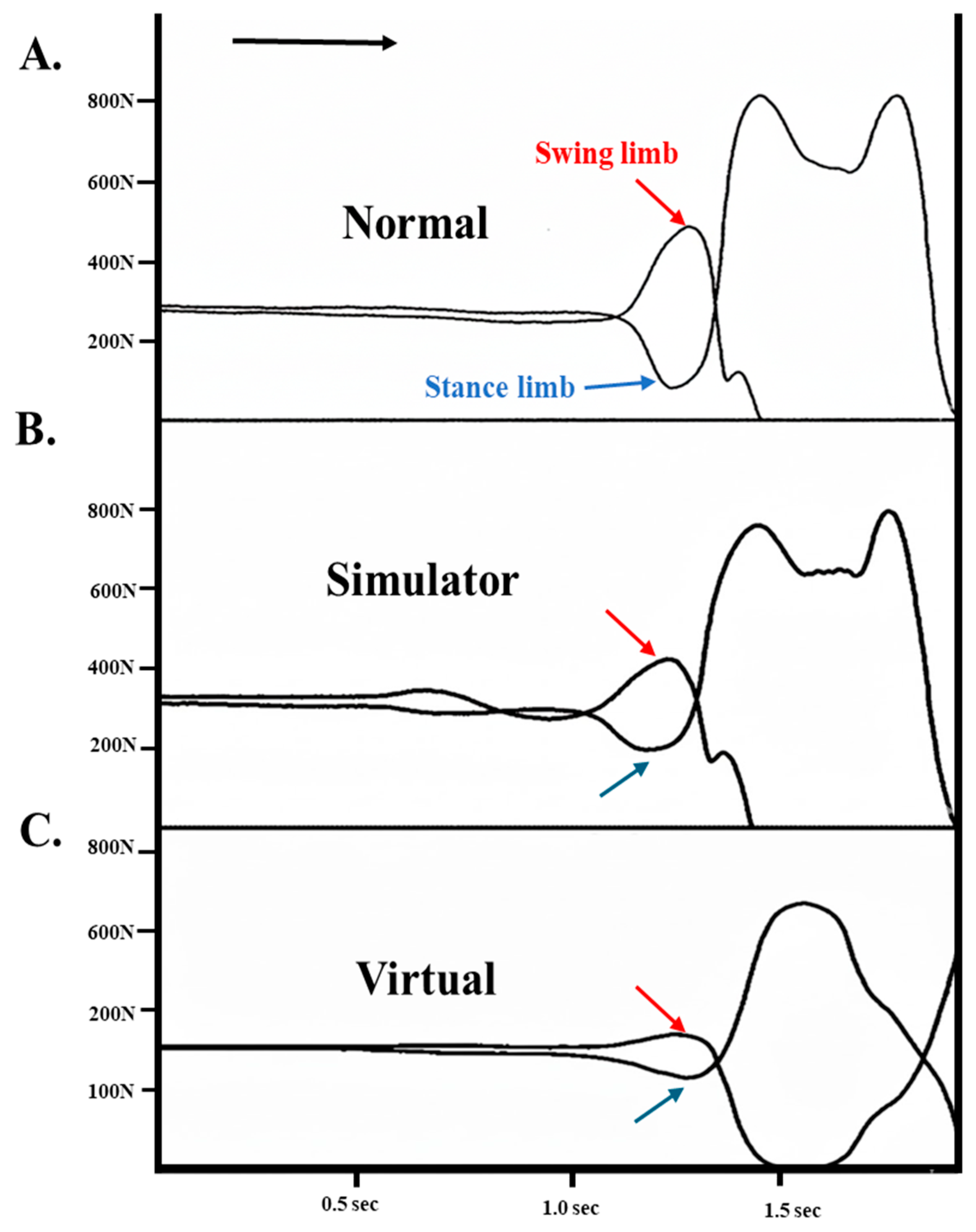 Each temporal event of GI was captured by the vertical ground reaction force between swing and stance limbs with the Tekscan High-Resolution Floor Mat System. These temporal events of GI are illustrated in