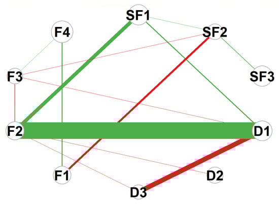 Network structure of symptoms in advanced cancer patients. Abbreviations: F1 = Physical Function; F2 = Social/Family Function; F3 = Emotional Function; F4 = Functional Status; SF1 = Cognitive Fatigue; SF2 = Emotional Fatigue; SF3 = Behavioral Fatigue; D1 = Uncertainty; D2 = Decision-Influencing Factors; D3 = Effective Decision-Making. Note: Edge: Thickness represents the absolute value of partial correlation coefficients; color indicates correlation direction (green: positive correlation, r = 0.1~0.5; red: negative correlation, r = −0.1~−0.5). Node: Size represents the Expected Influence (EI) value; the larger the node diameter, the higher the EI value (nodes with larger diameters correspond to EI ≥ 0.3).