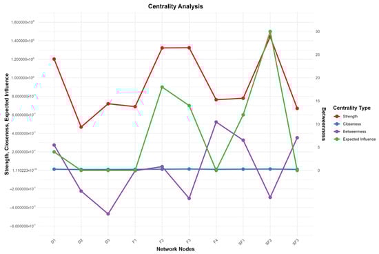 Centrality Analysis. Abbreviations: F1 = Physical Function; F2 = Social/Family Function; F3 = Emotional Function; F4 = Functional Status; SF1 = Cognitive Depletion; SF2 = Emotional Depletion; SF3 = Behavioral Depletion; D1 = Uncertainty; D2 = Decision-Influencing Factors; D3 = Effective Decision-Making. Note: This figure displays the comparison of four centrality metrics across ten network nodes in the symptom network. The left y-axis represents the values for Strength, Closeness, and Expected Influence (ranging from −0.6 to 1.6), while the right y-axis shows the Betweenness values (ranging from 0 to 30). Different colored lines and points indicate different centrality metrics: red for Strength (node strength, reflecting the closeness of connections between a node and other nodes), blue for Closeness (closeness centrality, reflecting the average shortest distance from a node to all other nodes in the network), green for Betweenness (betweenness centrality, reflecting the mediating role of a node in network information transmission), and purple for Expected Influence (expected influence, reflecting the potential impact of a node on the network).