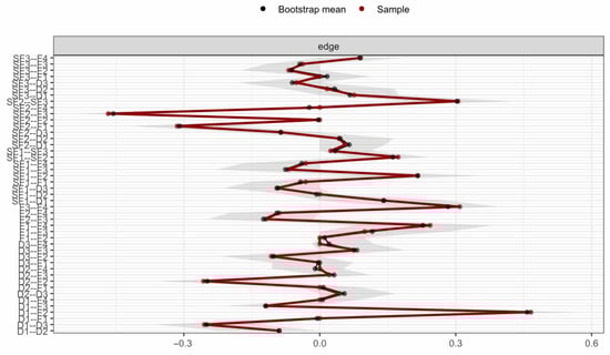 To ensure result reliability, the network structure was tested for stability using the case-deletion bootstrap method, showing high stability: edge weight stability (CS = 0.75) met the “excellent” standard (CS ≥ 0.75) confirming reliable inter-node connection strength, while node strength stability (CS = 0.75) reached the “good” standard (CS ≥ 0.6) and far exceeded the 0.5 minimum threshold, ensuring the centrality of core nodes (especially F4) is generalizable to similar patient groups. Bootstrap confidence intervals for edge coefficients (Table 1) show that 92% of edges have confidence intervals excluding zero, further supporting the robustness of the network structure. Centrality and edge weight stability are shown in Figure 4 and Figure 5 respectively—Figure 4 reveals that, even with 50% sample deletion, all nodes’ centrality indicator correlation remains well above 0.5, verifying structural robustness, and Figure 5 shows most edge weights have good stability, with correlation curves staying within the acceptable range during sample deletion—while Figure 6 summarizes core CS results, clearly showing both indicators exceed stability thresholds. These confirm the network structure, especially F4’s core node status, is robust and reliable, providing a solid basis for selecting clinical intervention targets.