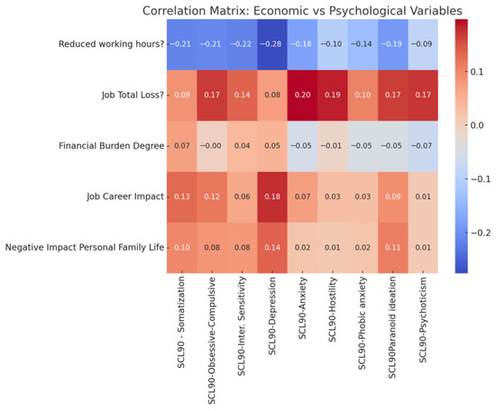 Caregivers reported a broad spectrum of psychological symptoms as assessed by the SCL-90-R, alongside heterogeneous levels of economic and occupational burden. Bivariate analyses using Pearson correlations demonstrated robust associations between specific economic stressors and psychological outcomes. Job loss was positively associated with anxiety and hostility, indicating that occupational disruption correlated with both internalizing and externalizing forms of psychological distress. In contrast, reduced working hours were inversely associated with depression and anxiety. Perceived financial burden, assessed through a single-item subjective indicator, showed weak and non-significant associations with most psychological domains. This pattern should not be interpreted as evidence of a limited role of economic strain but rather as a likely consequence of restricted measurement precision. More concrete and objectively verifiable economic disruptions—such as job loss or sustained reductions in working hours—appeared to function as more sensitive markers of economic stress in this context.