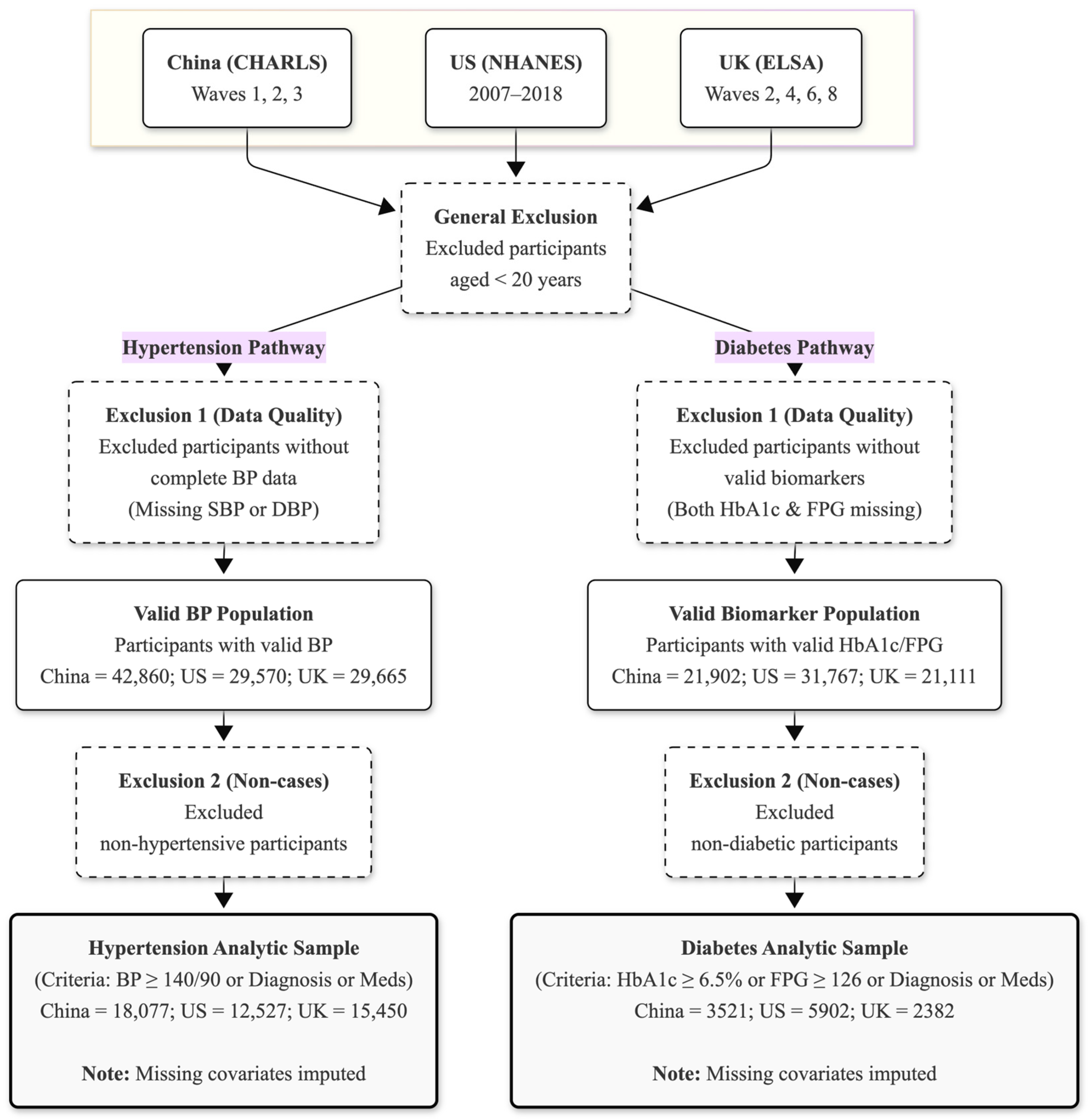 | Variables | Hypertension Population China (n = 18,077) | US (n = 12,527) | UK (n = 15,450) | Diabetes Population China (n = 3521) | US (n = 5902) | UK (n = 2382) |