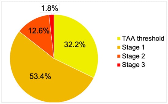 Among the 3525 patients evaluated, 1911 (54.2%) had above-target BP for TAA. Percentages for the different hypertension stages are depicted in Figure 1.