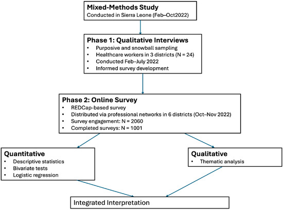 Our data come from a comprehensive mixed-methods [26] study conducted between February 2022 and October 2022 across six districts in Sierra Leone: Freetown, Kenema, Makeni, Port Loko, Bo, and Magburaka [27]. These districts recorded some of the highest caseloads during both the 2014–2016 Ebola outbreak and the COVID-19 pandemic and collectively account for a substantial proportion of the national healthcare workforce. The study was implemented in two phases designed to elicit complementary perspectives on COVID-19 vaccine and booster uptake. Because no comprehensive national sampling frame of healthcare workers exists in Sierra Leone, probability-based sampling was not feasible. We therefore employed non-probability sampling strategies appropriate for low-resource and emergency contexts [28,29]. Eligibility criteria for participation in both phases included being aged 18 years or older and holding a healthcare role within the selected districts. While the resulting sample is not statistically representative of all healthcare workers nationally, the purposive selection of high-burden districts corresponds to regions that account for a substantial share of the national health workforce [30,31]. The sample, therefore, reflects workforce concentrations in settings most affected by epidemic strain and is analytically informative for understanding vaccination experiences in these contexts.