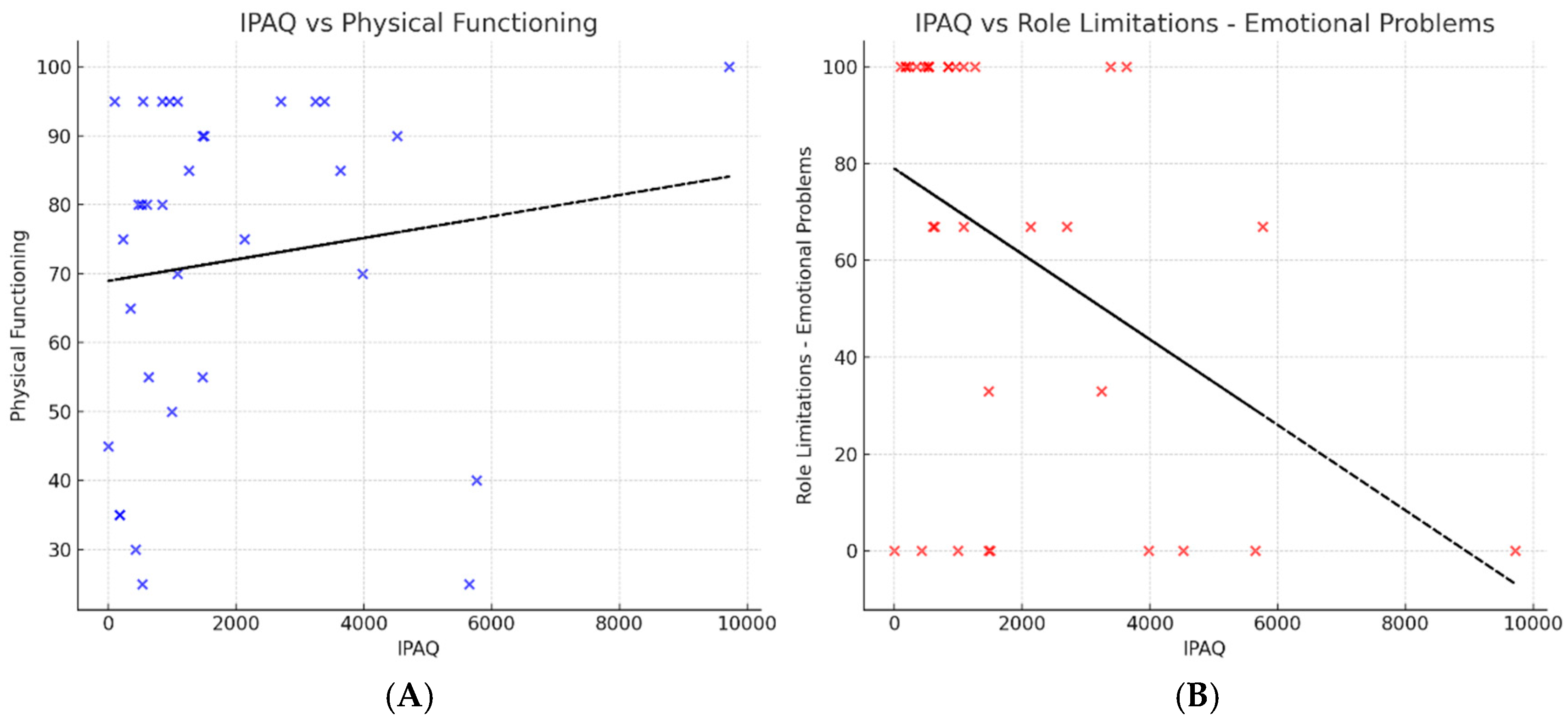 16]. Interestingly, we also found a negative correlation between physical activity and role limitations due to emotional problems, suggesting that active patients may experience fewer psychosocial barriers. This interplay between physical and mental well-being has been observed in other chronic disease cohorts and may reflect both the physiological and psychological benefits of regular activity [