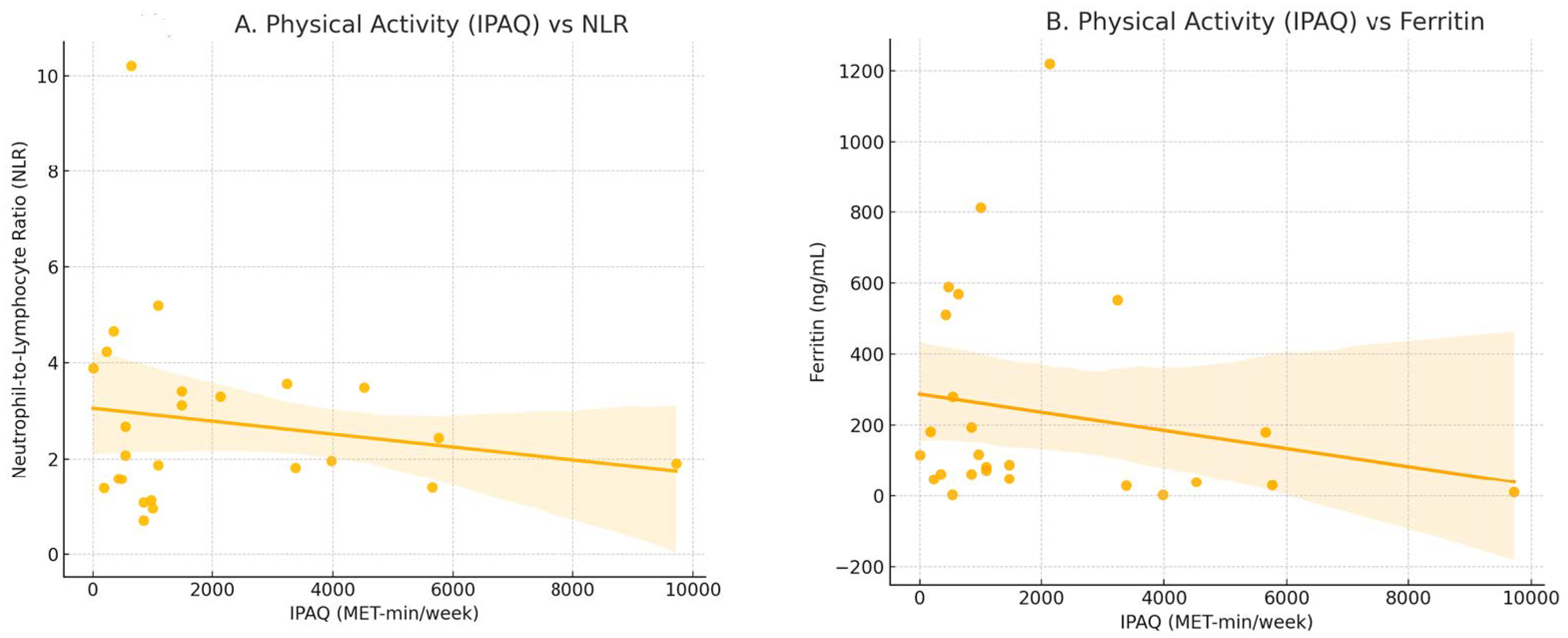 A weak negative trend was observed between IPAQ and ferritin (Spearman’s ρ = −0.283, p = 0.162) and TyG index (ρ = −0.176, p = 0.335), but these did not reach statistical significance.