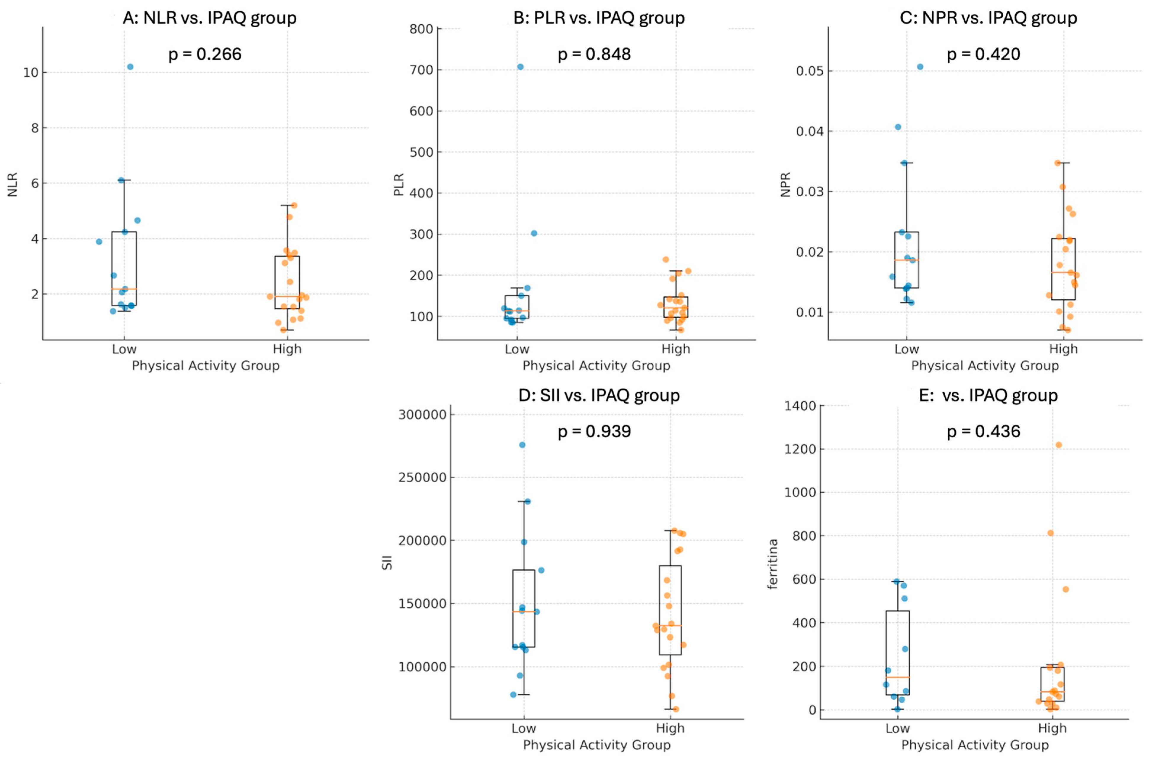 The analysis of inflammatory markers (NLR, PLR, NPR, and SII) showed no statistically significant differences between the low and high physical activity groups: