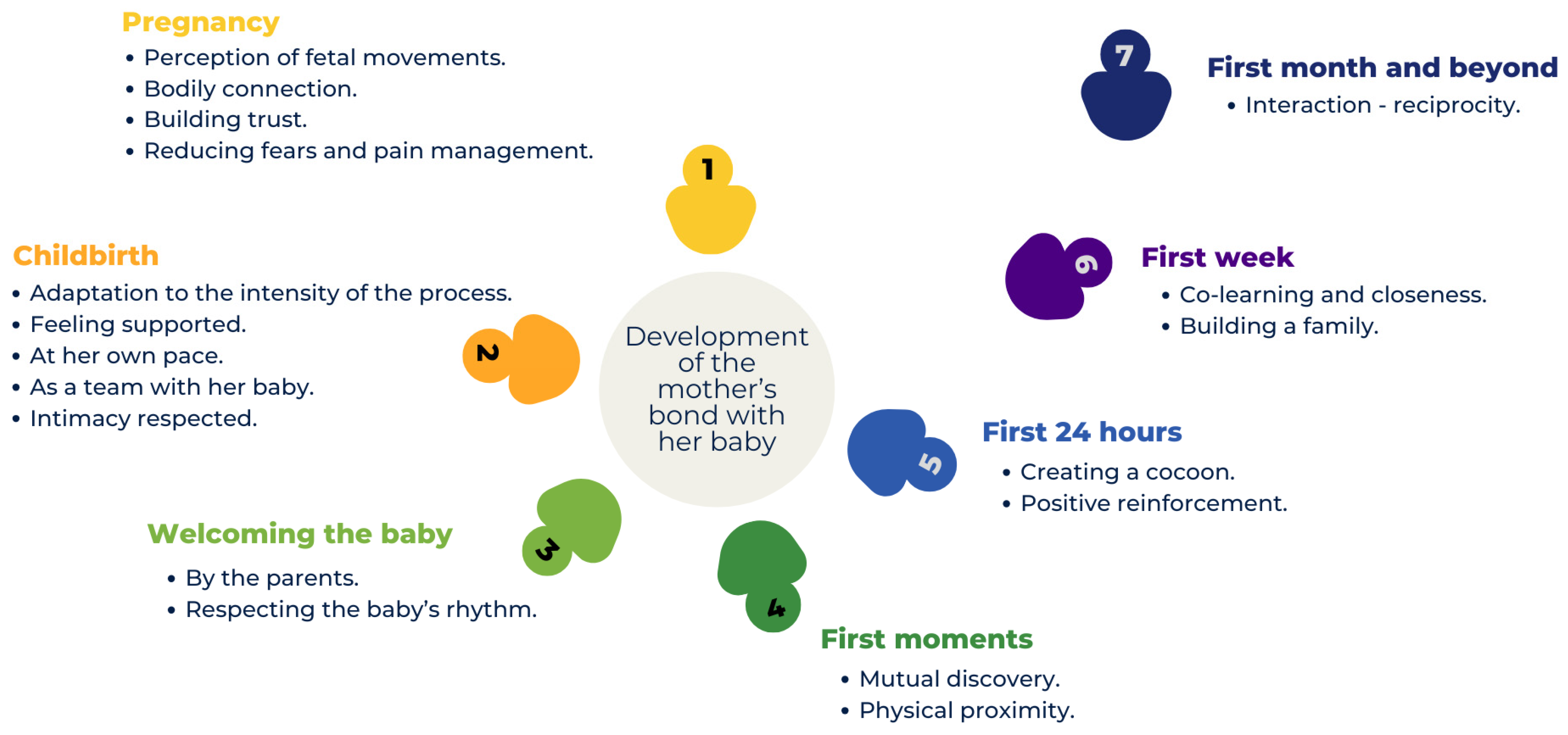| Rhythm | Respecting the rhythms surrounding birth allows the mother to integrate her experience and positively promotes the establishment of her relationship with her baby. |