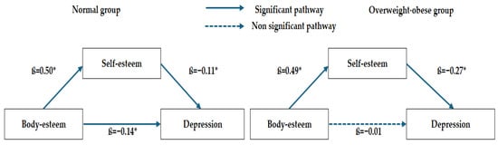 In the overweight/obese group, body-esteem significantly predicted self-esteem (ß = 0.49), and self-esteem significantly predicted depression (ß = −0.27). However, the direct effect of body-esteem on depression was not significant (ß = −0.01, p = 0.895). The indirect effect of body-esteem on depression through self-esteem remained significant (ß = −0.13, 95% CI: −0.24 to −0.04).