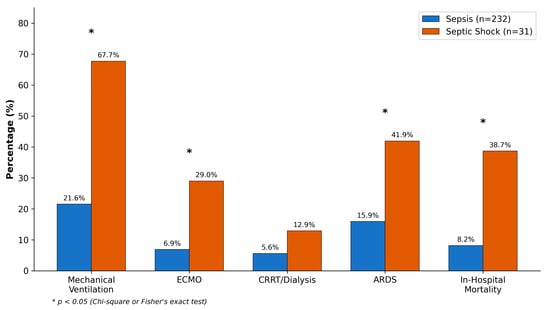 Organ support requirements differed substantially between groups (Table 5, Figure 3). Mechanical ventilation was instituted in 21 septic shock patients (67.7%) compared to 50 sepsis patients (21.6%; p < 0.001). Norepinephrine was the primary vasopressor, used in all septic shock patients at a median maximum dose of 0.25 μg/kg/min (IQR: 0.12–0.48). ECMO, deployed for ARDS-associated refractory hypoxemia, was utilized in 9 septic shock patients (29.0%) and 16 sepsis patients (6.9%; p < 0.001). ARDS developed in 41.9% of septic shock versus 16.0% of sepsis patients (p < 0.001).