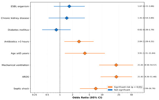Univariate logistic regression identified septic shock (OR: 7.08; 95% CI: 2.99–16.76), ARDS (OR: 21.83; 95% CI: 9.26–51.48), mechanical ventilation (OR: 21.61; 95% CI: 8.56–54.57), age ≥ 65 years (OR: 3.91; 95% CI: 1.31–11.64), and delayed antibiotics > 3 h (OR: 2.84; 95% CI: 1.28–6.31) as mortality risk factors (Table 6, Figure 4).