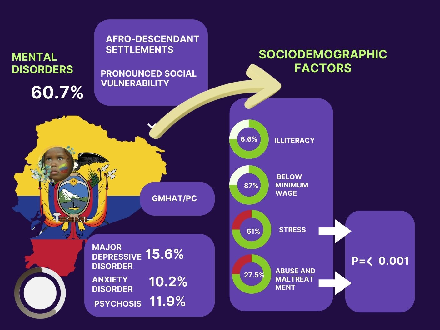 This study aimed to estimate the prevalence of mental disorders and identify their social and economic determinants among adults from African American communities in the Chota River basin, Ecuador. Specifically, associations were evaluated between mental disorders diagnosed via GMHAT/PC and factors such as perceived stress, experiences of abuse, socioeconomic level, and medical comorbidities, using two-stage cluster probability sampling (n = 557). The findings will provide local evidence to guide culturally appropriate preventive interventions. [