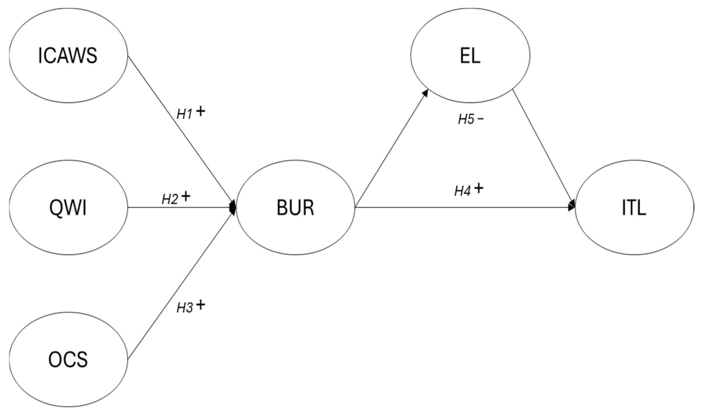 - H5: Ethical leadership style (EL) mediates the relationship between burnout and nurses’ intention to leave work (ITL).
