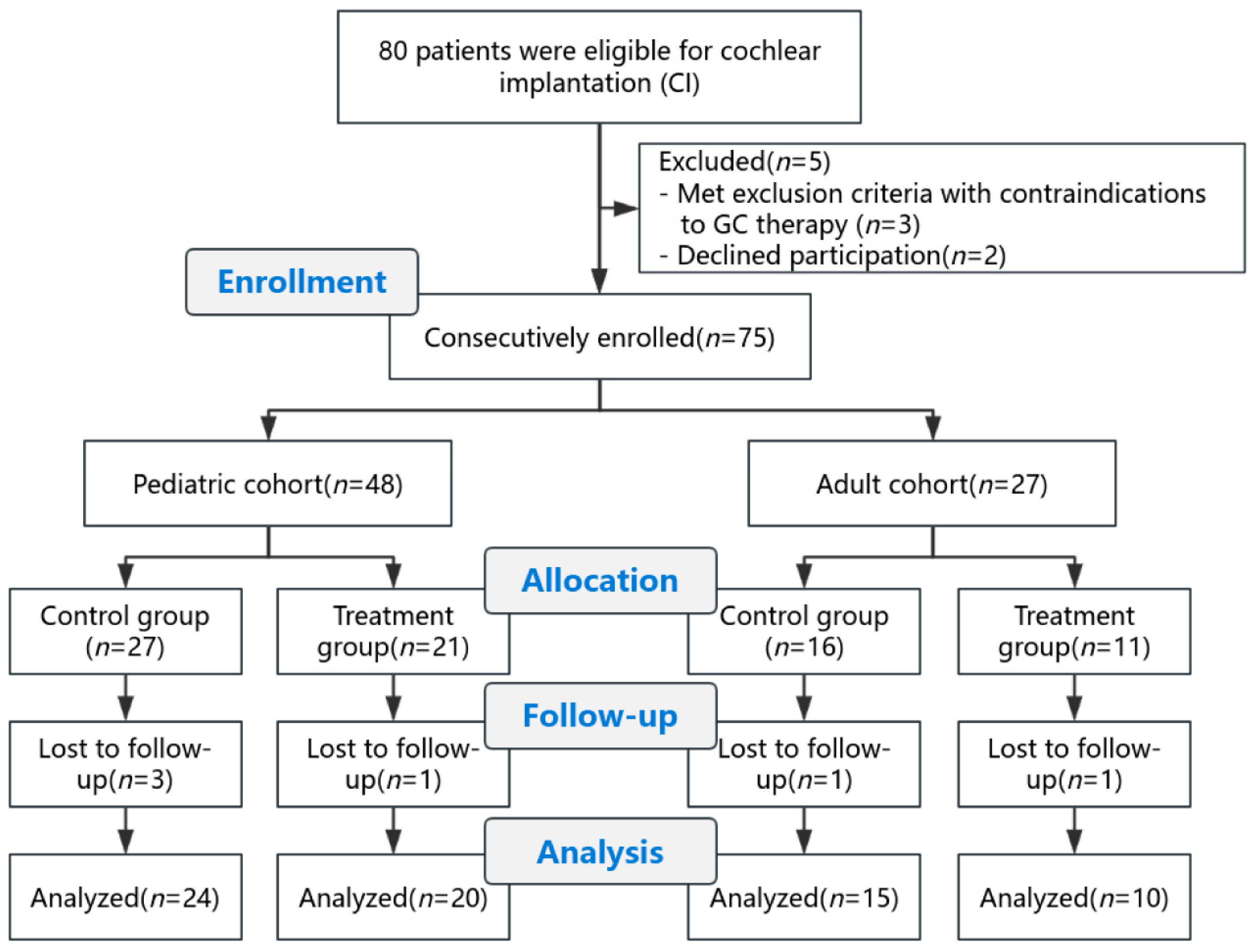 Initially, 80 patients were assessed for eligibility for cochlear implantation. Five patients were excluded prior to enrollment (three met exclusion criteria with contraindications to GC therapy and two declined participation), leaving 75 participants who were consecutively enrolled in the study.