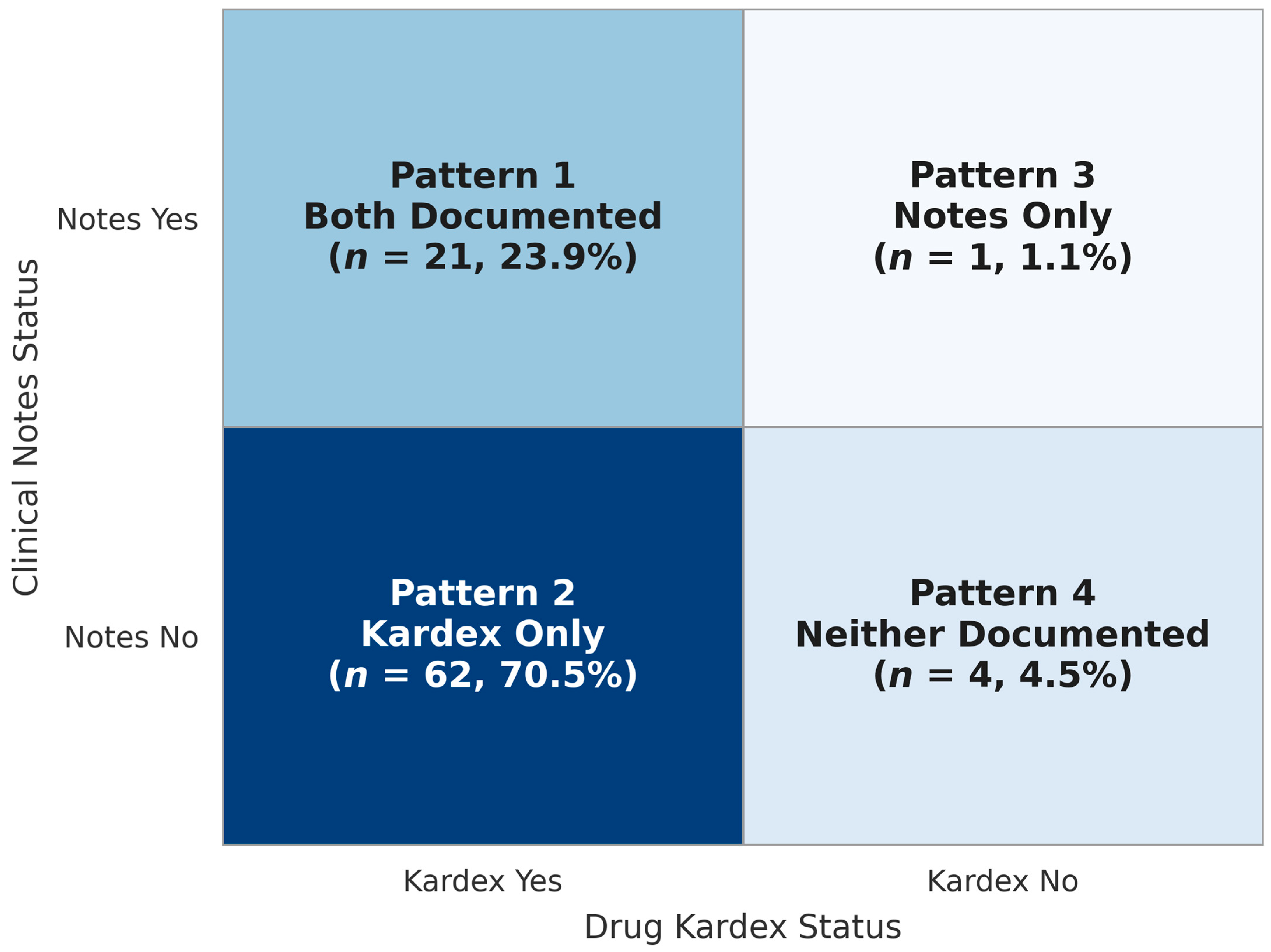 The predominance of Kardex-only documentation suggests information asymmetry: allergy data moves from physician notes to nursing medication records more reliably than in the reverse direction. This pattern is expected in paper workflows in which records are physically separated and accessed at different times by different teams.