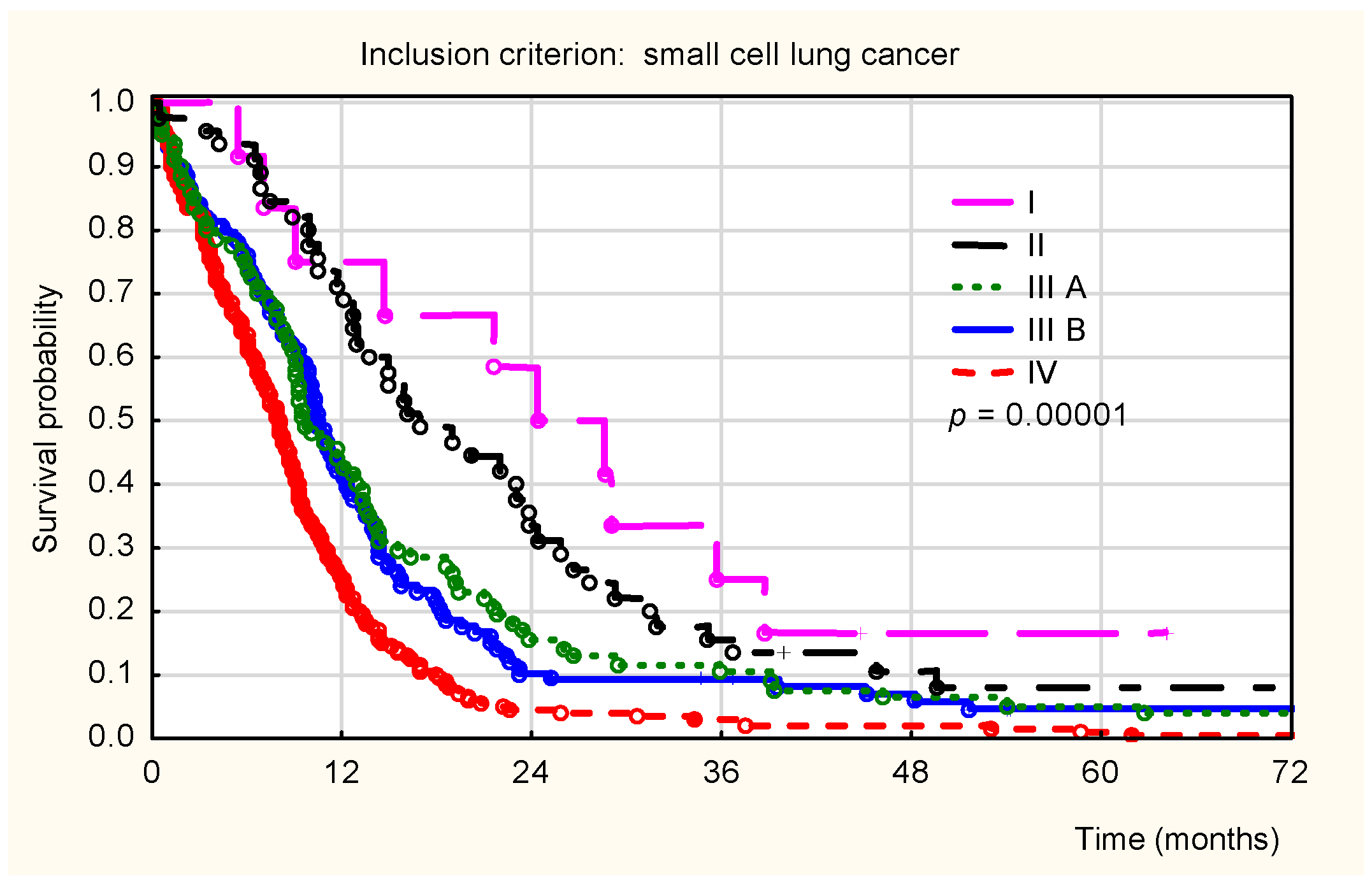 Among SCLC patients treated with platinum-based regimens combined with etoposide and radiotherapy, statistical analysis demonstrated significant differences in survival duration according to disease stage (p < 0.001). As expected, survival probability systematically declined, with the longest survival observed in stages I-II and the shortest in stage IV, despite the use of radiotherapy.