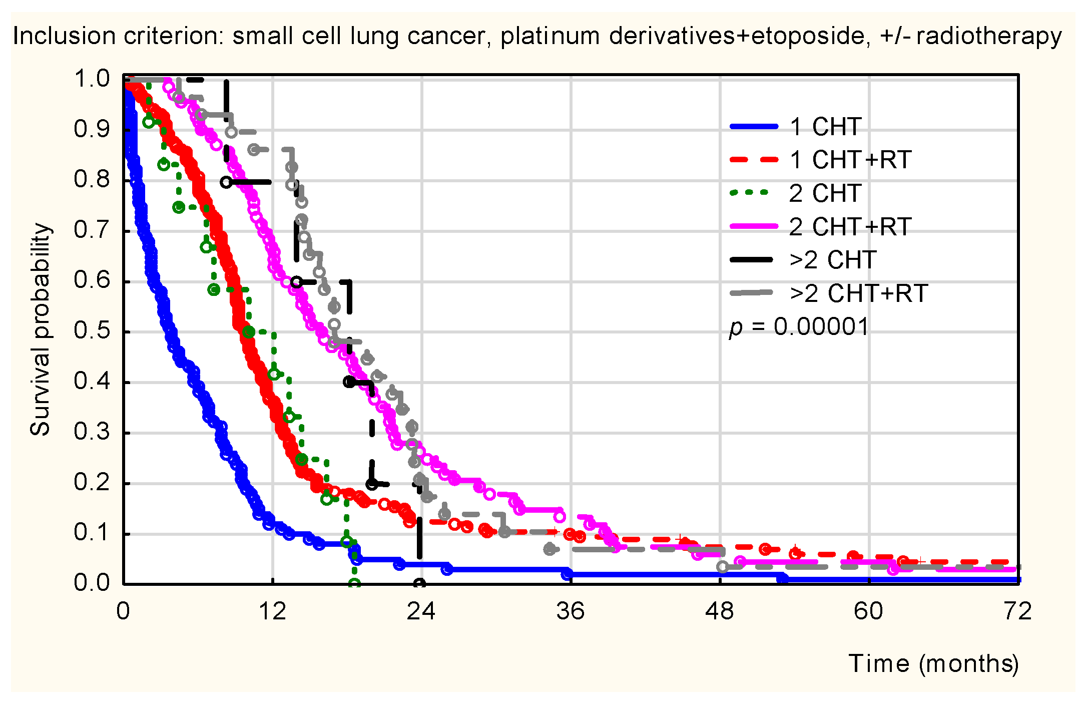 Within this subgroup (platinum plus etoposide), statistically significant differences in survival were also observed based on the number of treatment cycles administered and the addition of radiotherapy. Patients receiving chemoradiotherapy exhibited higher survival probabilities compared to those treated with chemotherapy alone. The lowest survival probability was observed in patients receiving a single cycle of chemotherapy, whereas the highest was seen in those receiving more than two cycles of chemoradiotherapy.