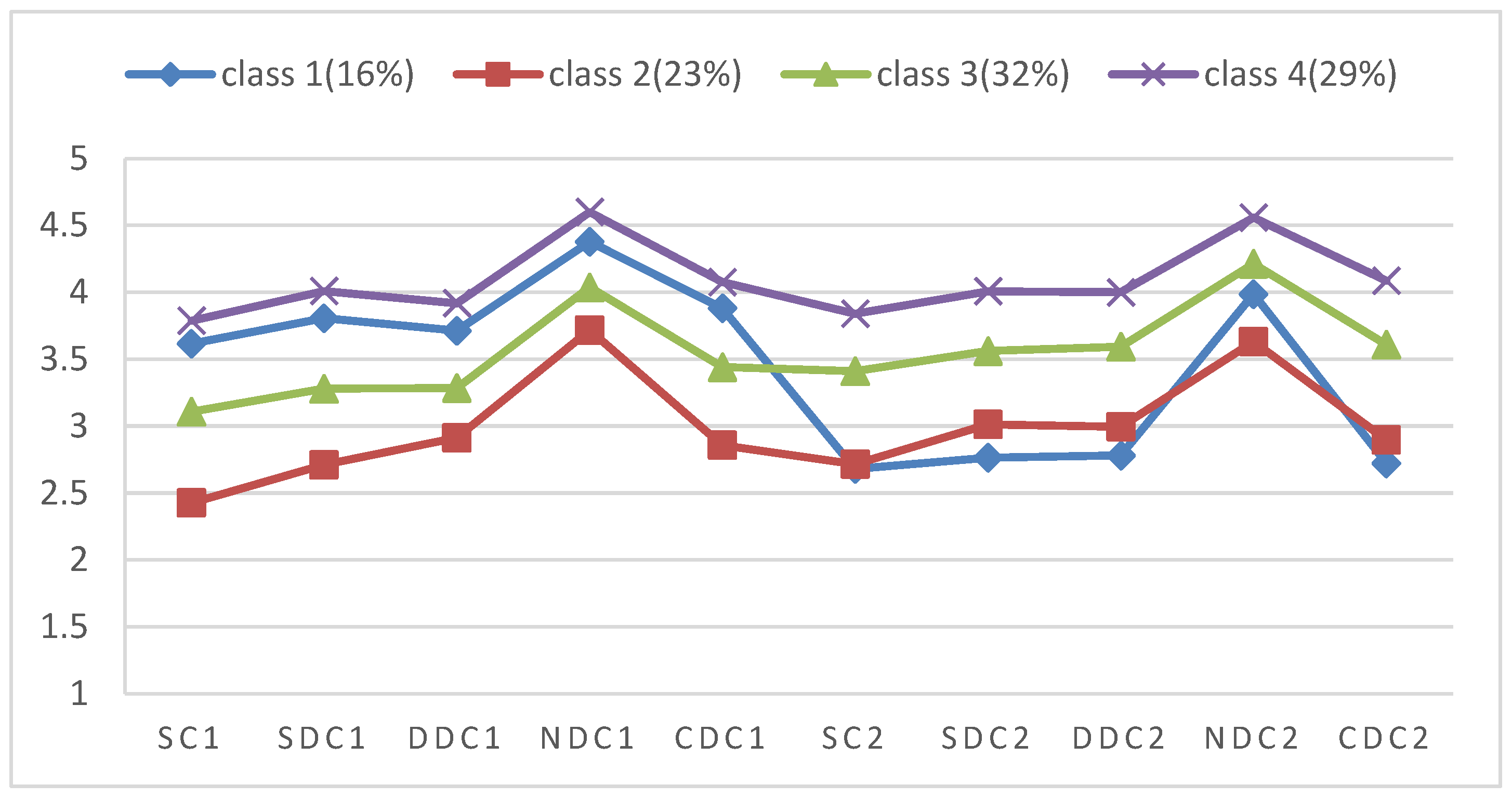 | Pairwise differences | Class 4 < 2 and 3; Class 2 > 1, 3 and 4; Class 3 > 1 | Class 4 > 1 > 3 = 2 | Class 4 < 1, 2 and 3; Class 1 > 3 and 4 | Class 4 >1, 2 and 3; Class 3 > 2 | |