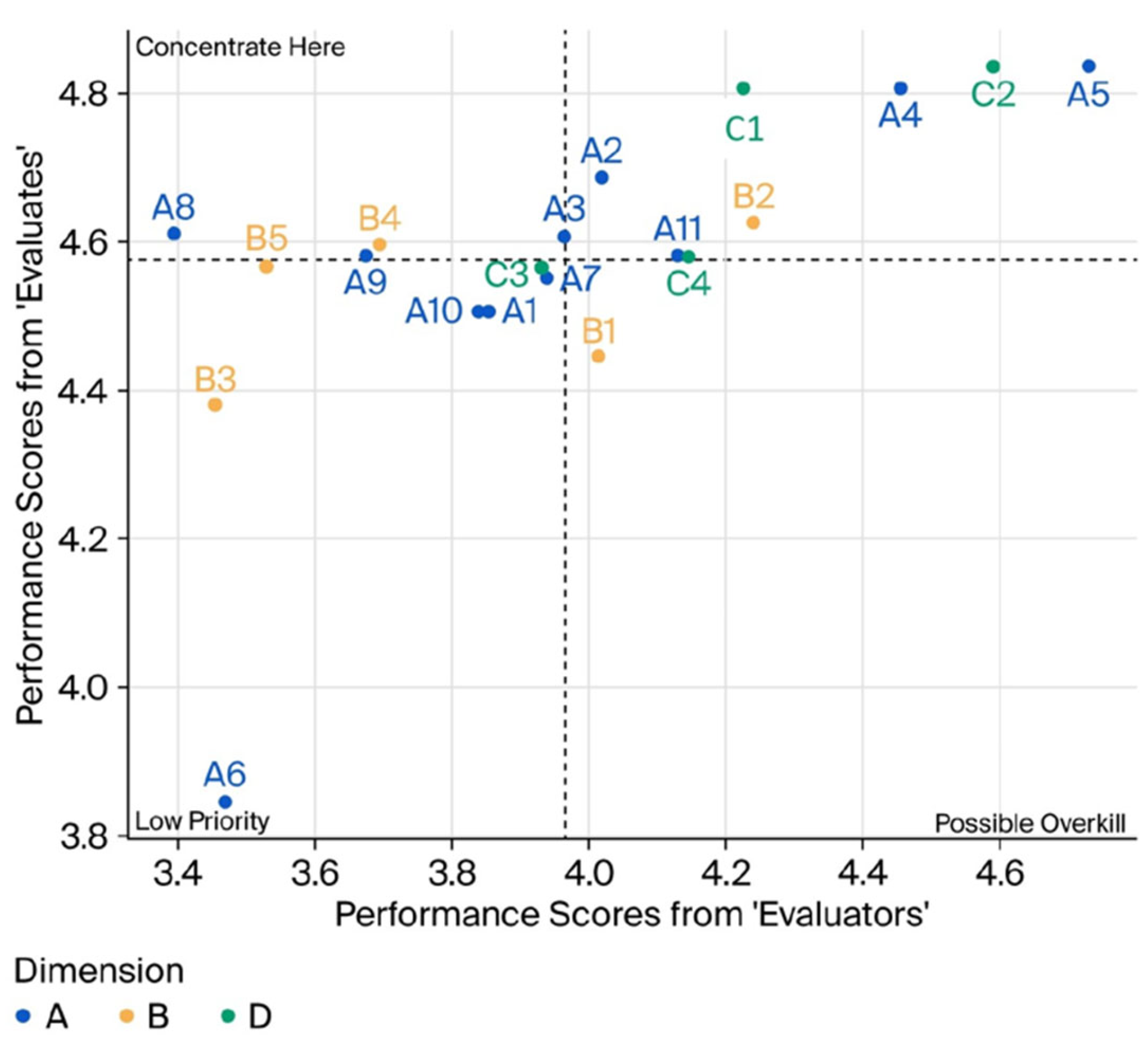 - Blind Spots: Where internal self-assessment significantly exceeds external verification (comparable to the “Concentrate Here” priority in the classical model).