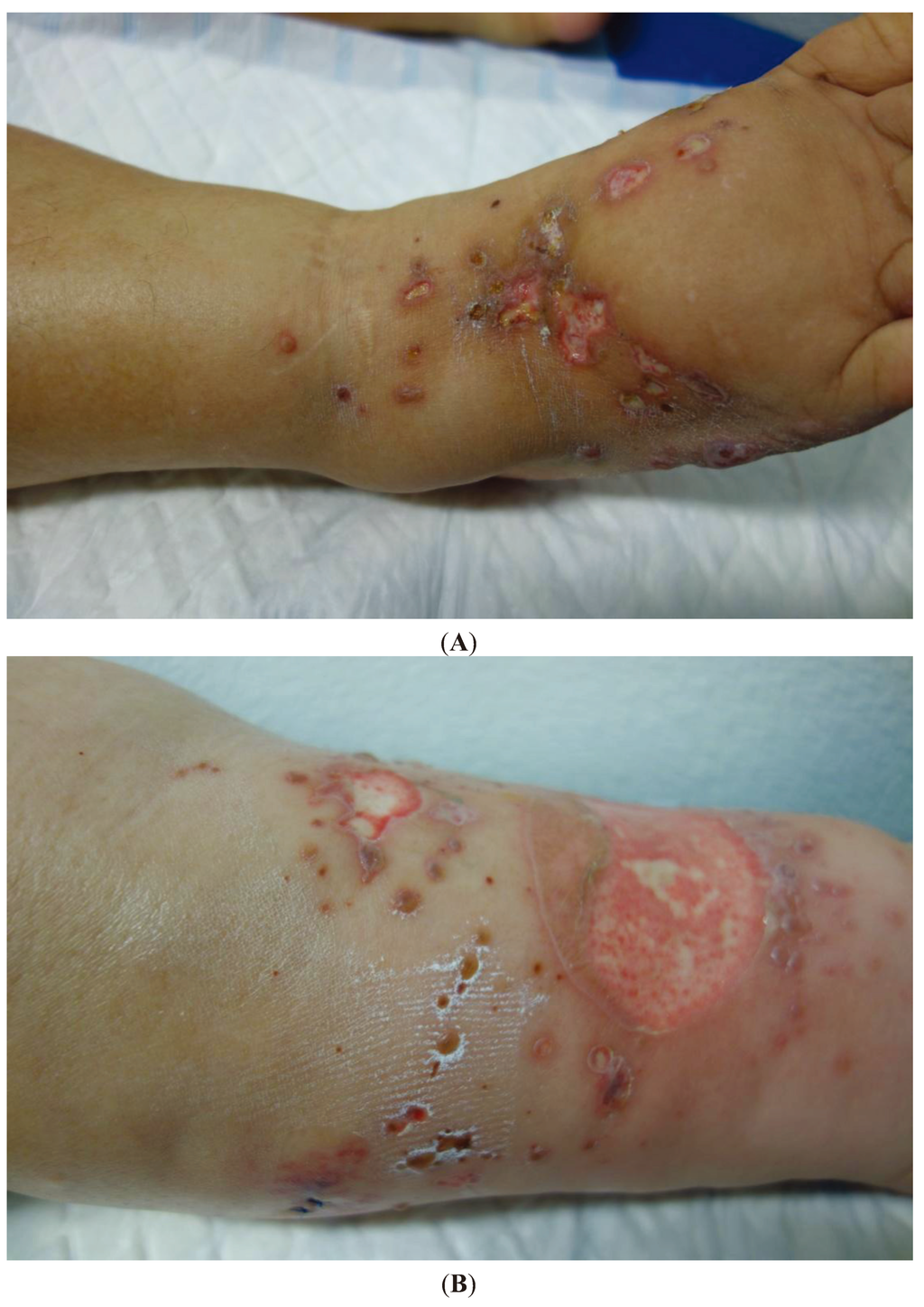 Erosions and ulcers affecting the dorsal aspect of the right foot (A) and the anterior, inner and outer surfaces of the left leg (B).