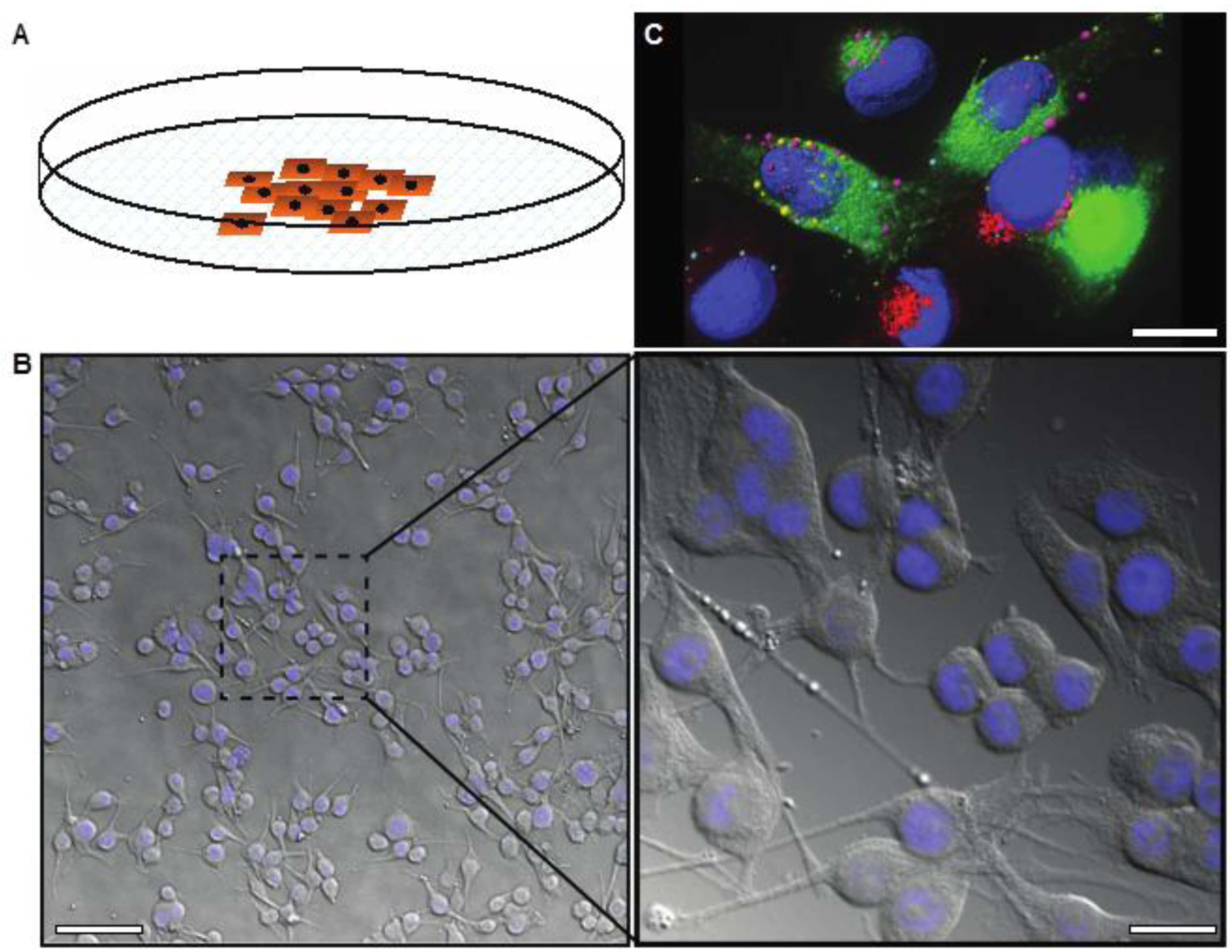 (A) Image showing two-dimensional cell growth in adherent cell culture in a plastic culture dish; (B) Differential interference contrast image overlaid with DAPI stain (nuclei, blue) demonstrating the morphology of melanoma cells in 2D culture, low and high magnification; (C) Deconvolved immunofluorescence image representing the highly complex internal structure of melanoma cells, labeled with markers for different endosomes or secretory vesicles (pink, red, or green) and the nucleus (blue). Scale bars: (B) 50 μm (left), 12 μm (right); (C) 6 μm.