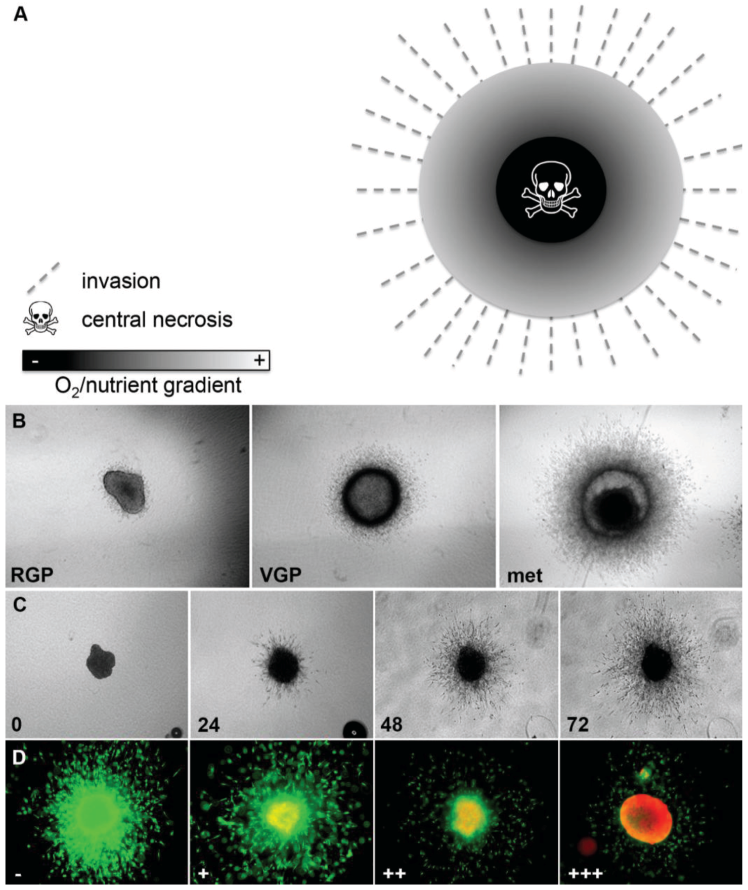 Melanoma spheroid model. (A) Image demonstrating oxygen and nutrient gradient within a 3D spheroid, central necrosis and invasion of melanoma cells into the tumor stroma; (B) Growth and invasion behavior of melanoma spheroids reflects that of the original tumors: radial (RGP), vertical growth phase (VGP), metastasis (met); (C) Growth and invasion of a spheroid derived from a metastatic cell line (numbers: time in h); (D) Spheroid treated with increasing doses of the BRAF inhibitor vemurafenib (−, +, ++, +++) and stained with a live/dead assay (green: calcein-AM, live; red: ethidium bromide, dead). Note the increasing growth and invasion inhibition, as well as cell death.