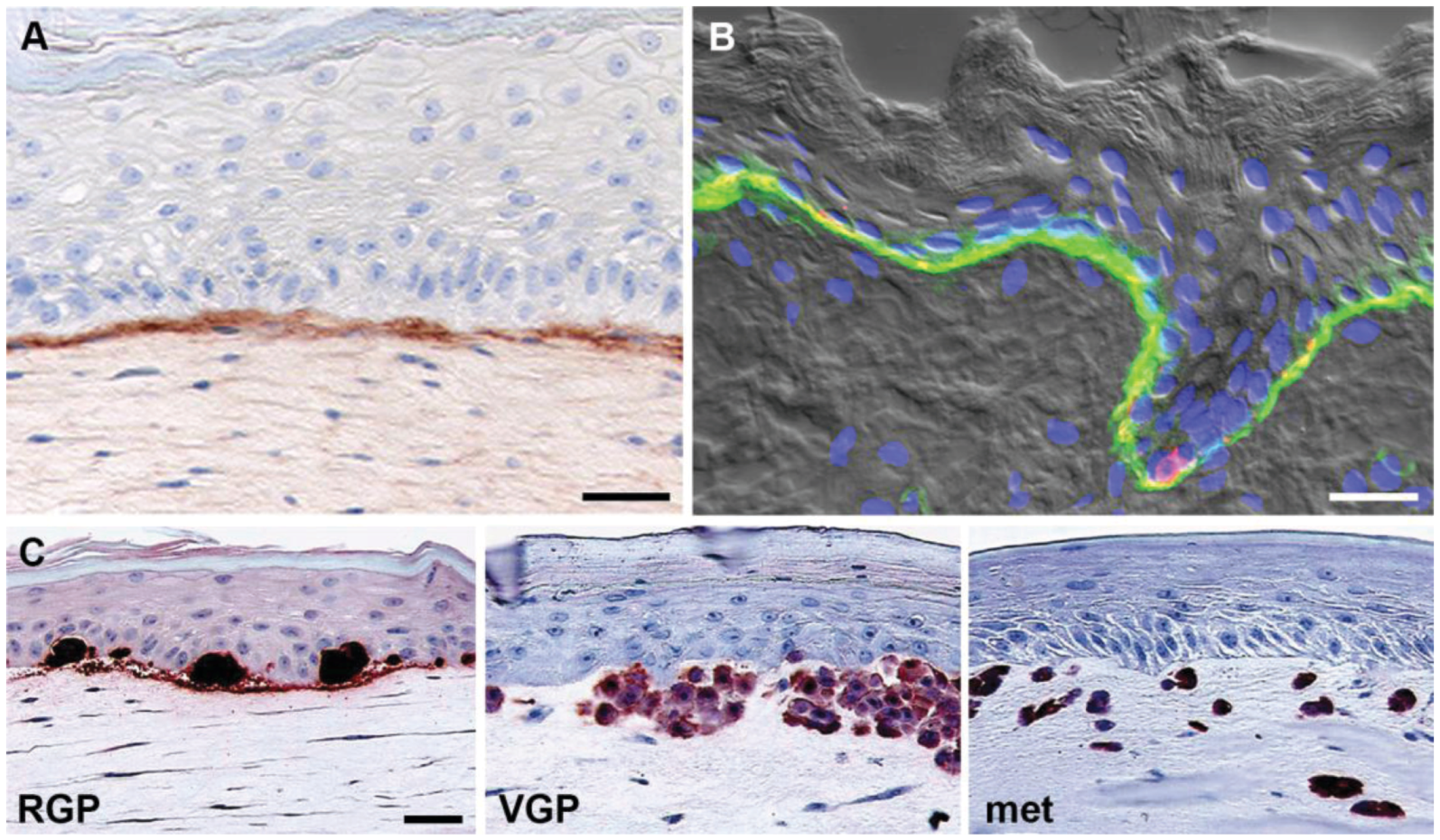 3D skin reconstruct model. (A) Model: Keratinocytes and fibroblasts in human skin reconstructs produce a basement membrane (stained with a monoclonal antibody against collagen IV). Note the clear demarcation of the basement membrane; (B) Skin: Human fetal foreskin stained with a monoclonal antibody against α6 integrin (green) and the melanocyte marker HMB45 (red), highlighting the continuous basement membrane between epidermis including basal keratinocytes and melanocytes (co-localization, yellow) and dermis. Note the similarity between model and original; (C) Melanoma cells recapitulate original tumor phenotype in reconstructed skin. Melanoma cells were stained for S100. Radial growth phase (RGP) melanoma cells proliferate and form nests in the epidermis, but do not invade the dermis. Vertical growth phase (VGP) cells cross the basement membrane, invade and proliferate in the dermis. Cells from metastatic (met) melanoma rapidly invade deep into the dermal compartment. Figure adapted from Haass et al., 2005 [12] and Santiago-Walker et al., 2009 [11]. Scale bars: 30 μm.