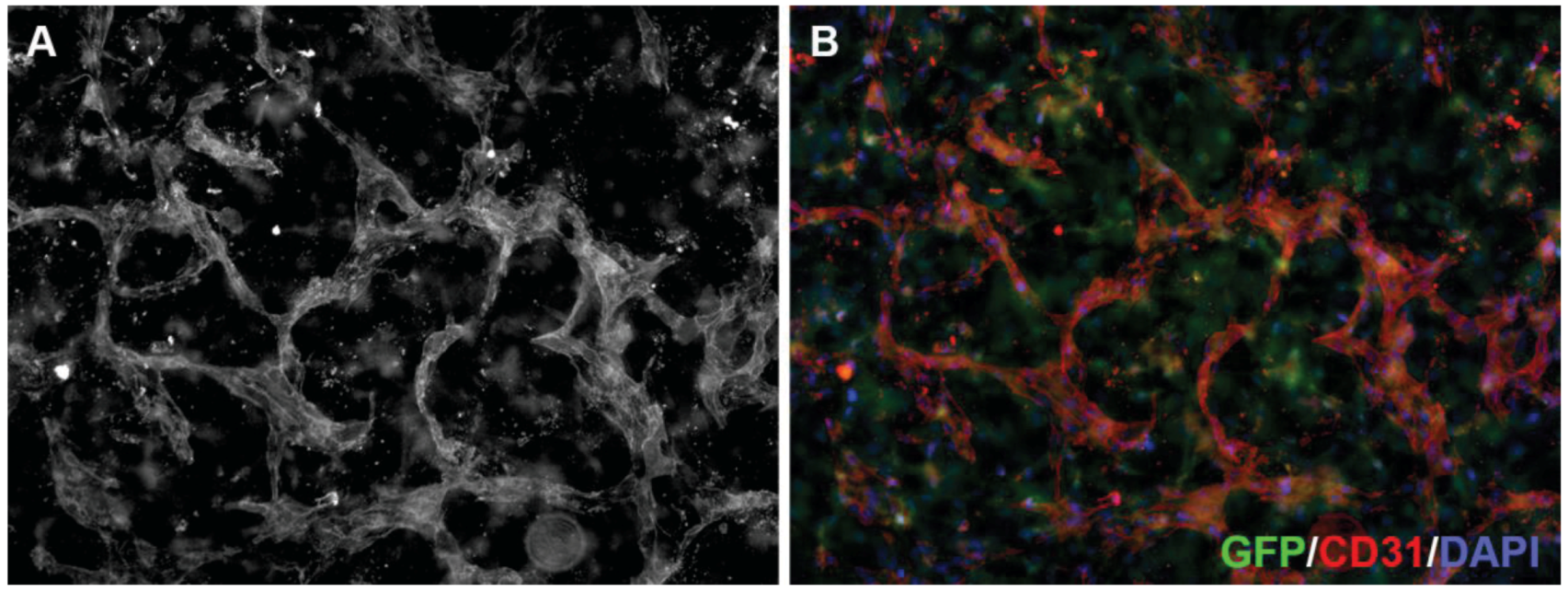 3D neoangiogenesis model. Human microvascular endothelial cells grown in a collagen gel containing green fluorescent protein (GFP)-expressing fibroblasts (green in B) for 144 h to allow the formation of a three-dimensional vascular network, were fixed and incubated with an antibody against CD31 (A; red in B) and stained with DAPI (blue in B). Tube formation and branching frequency are used to quantify anti-angiogenic drug effects.
