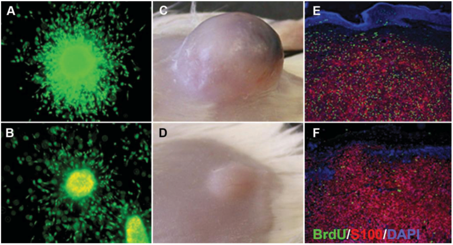 Comparison of 3D melanoma spheroid and xenograft. (A) Untreated spheroid; (B) spheroid treated with 10 μM selumetinib (MEK1/2 inhibitor AZD6244; Astra Zeneca) and stained with a live/dead assay (green: calcein-AM, live; red: ethidium bromide, dead). Note growth and invasion inhibition as well as increased cell death in the treated spheroid; (C) Untreated xenograft; (D) xenograft after treatment with 50 mg/kg selumetinib. Note the growth inhibition of the treated tumor. Sections of an untreated (E) and treated (F) xenograft stained for BrdU (green; proliferation marker), S100 (red, used here as a melanoma marker), and DAPI (blue, nuclear marker) showing a decrease in BrdU uptake after selumetinib treatment. Figure adapted from Haass et al., 2008 [24].